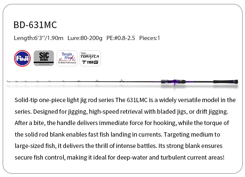 El 631LMC es un modelo muy versátil de la serie.Diseñado para jigging, recuperación a alta velocidad con jigs con cuchillas o jigging por deriva.Después de un bocado, el mango proporciona fuerza inmediata para el enganche, mientras que el par de la caña sólida en blanco permite un aterrizaje rápido de los peces en corrientes.Dirigido a peces de tamaño mediano a grande, brinda la emoción de las intensas batallas.¡Su fuerte espacio en blanco garantiza un control seguro de los peces, lo que lo hace ideal para áreas de aguas profundas y corrientes turbulentas!