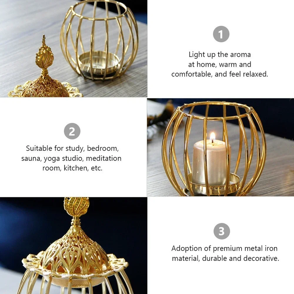 Este artículo es un candelabro con quemador de incienso 2 en 1, que adopta material de hierro metálico de primera calidad, duradero y decorativo.Se puede utilizar como portavelas cuando se retira la tapa y se puede utilizar como quemador de incienso cuando se coloca la tapa.Adecuado para estudio, dormitorio, sauna, estudio de yoga, sala de meditación, cocina, etc.