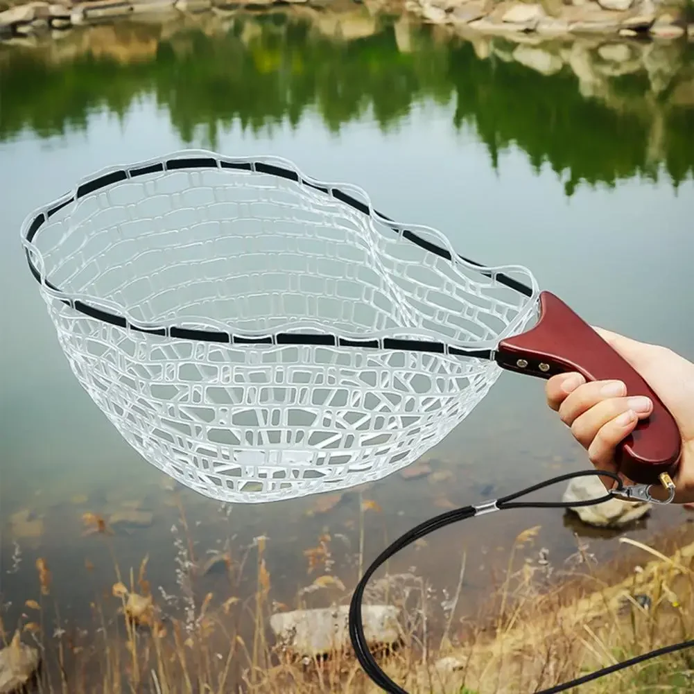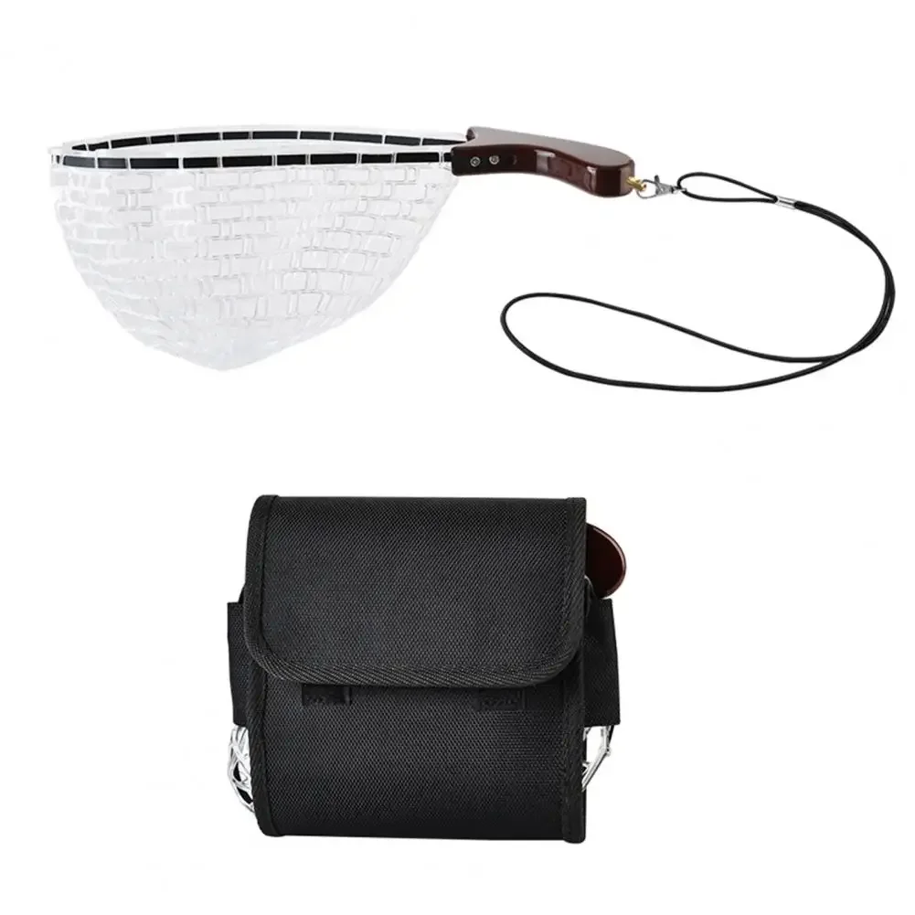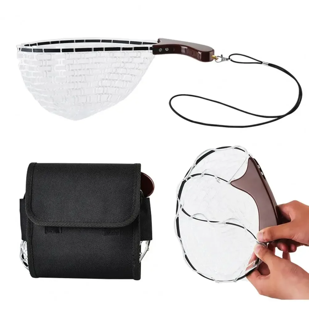 Características: mango tallado de madera, malla de secado rápido, accesorios de pesca.