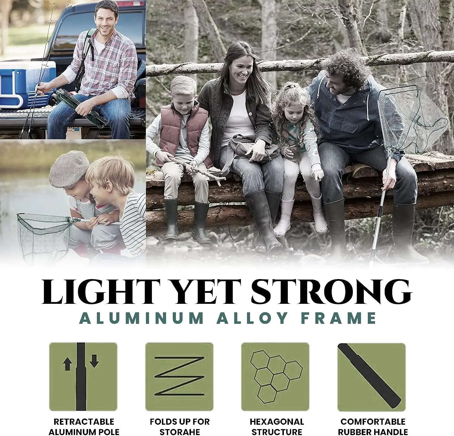 4. FÁCIL Y SEGURO DE MANEJAR: esta red de aterrizaje plegable portátil se puede plegar y extender fácilmente simplemente girando el sistema de bloqueo y fijando la hebilla de metal. Puede llevarlo fácilmente a cualquier lugar dentro de una bolsa normal después del plegado. Su suave malla no daña las escamas del pescado.