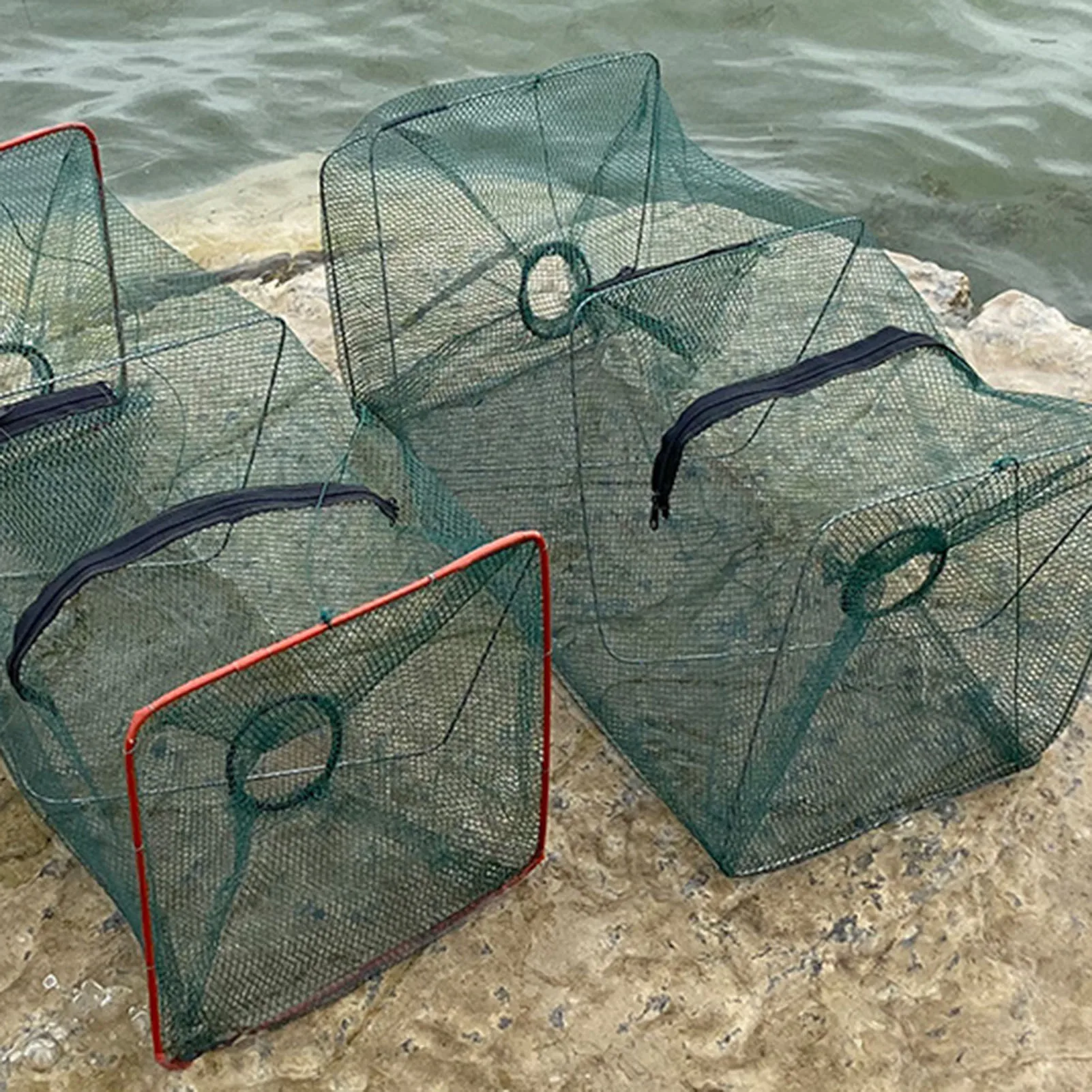 Construcción duradera: construidas con marcos metálicos resistentes y malla de nailon duradera, nuestras trampas de pesca están diseñadas para soportar los rigores de la captura de cangrejos y camarones, lo que garantiza un uso duradero.