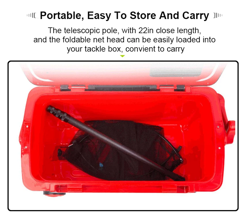 2. Fácil de almacenar y transportar, el poste telescópico, con 22 pulgadas de longitud cercana, y la cabeza de red plegable se puede cargar fácilmente en su caja de aparejos, conveniente para llevar