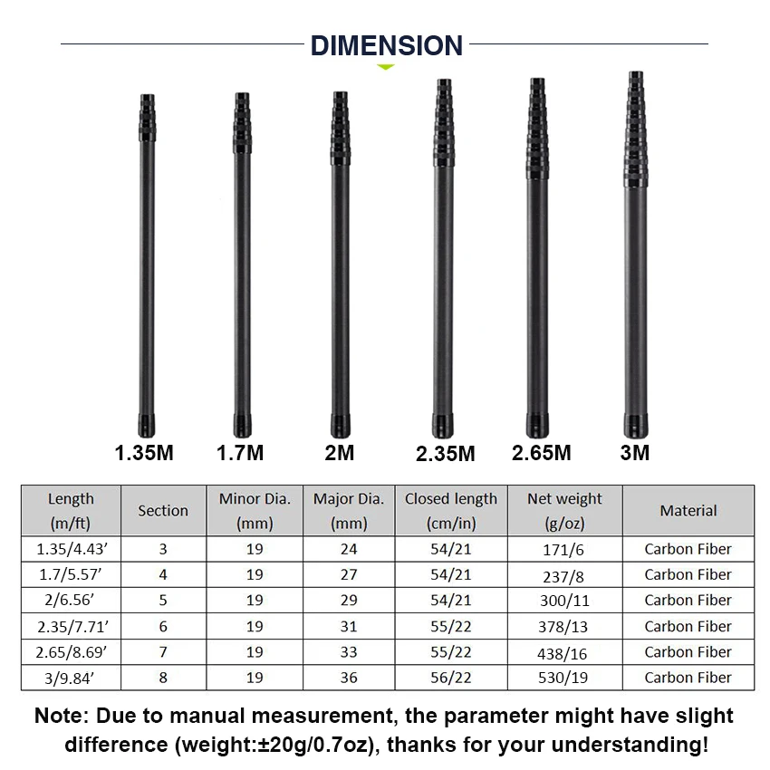 Longitud del poste abierto: 1,35; 1,7; 2; 2,35; 2,65; 3M/4; 6; 7; 8; 9; 10 pies