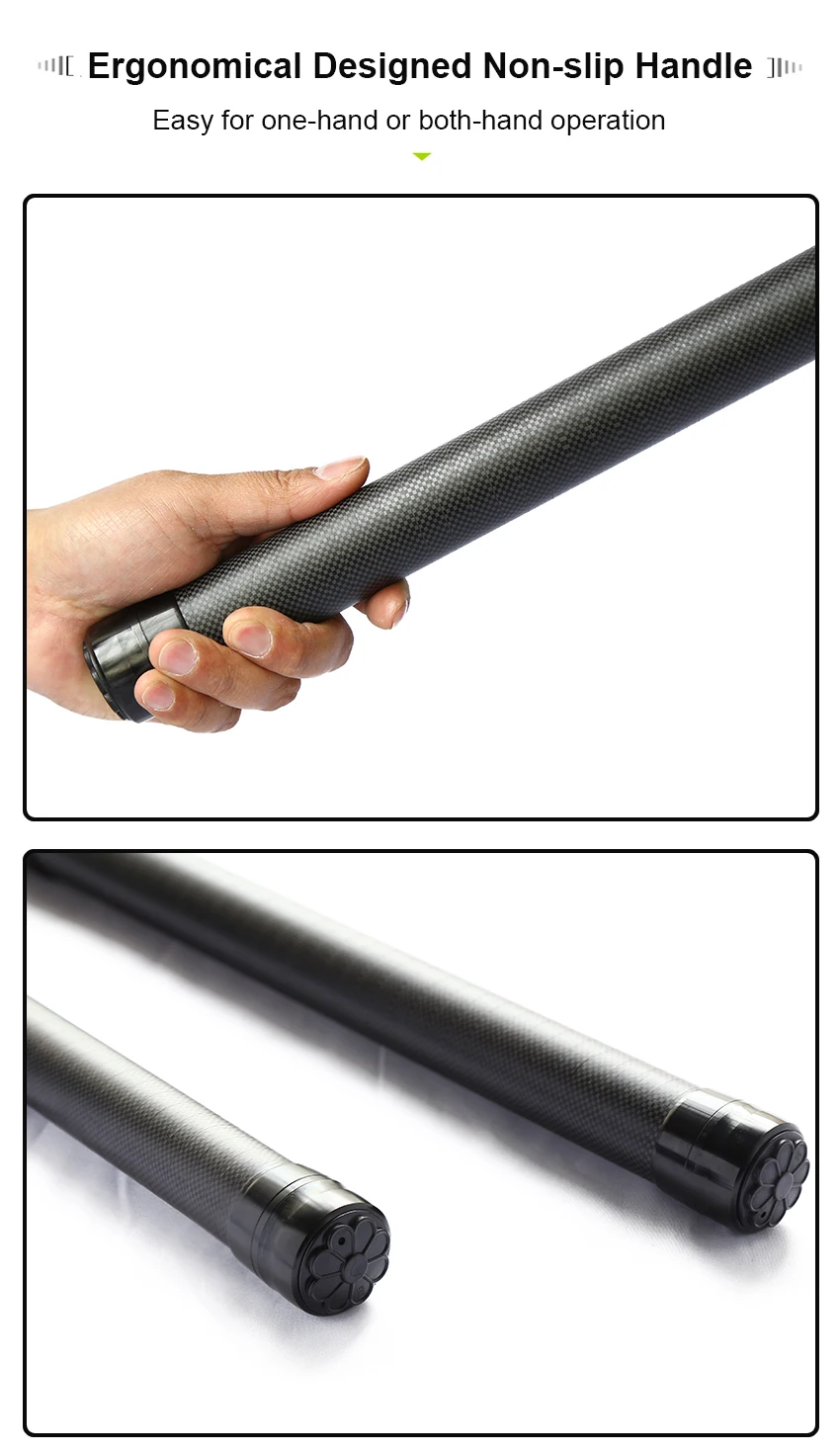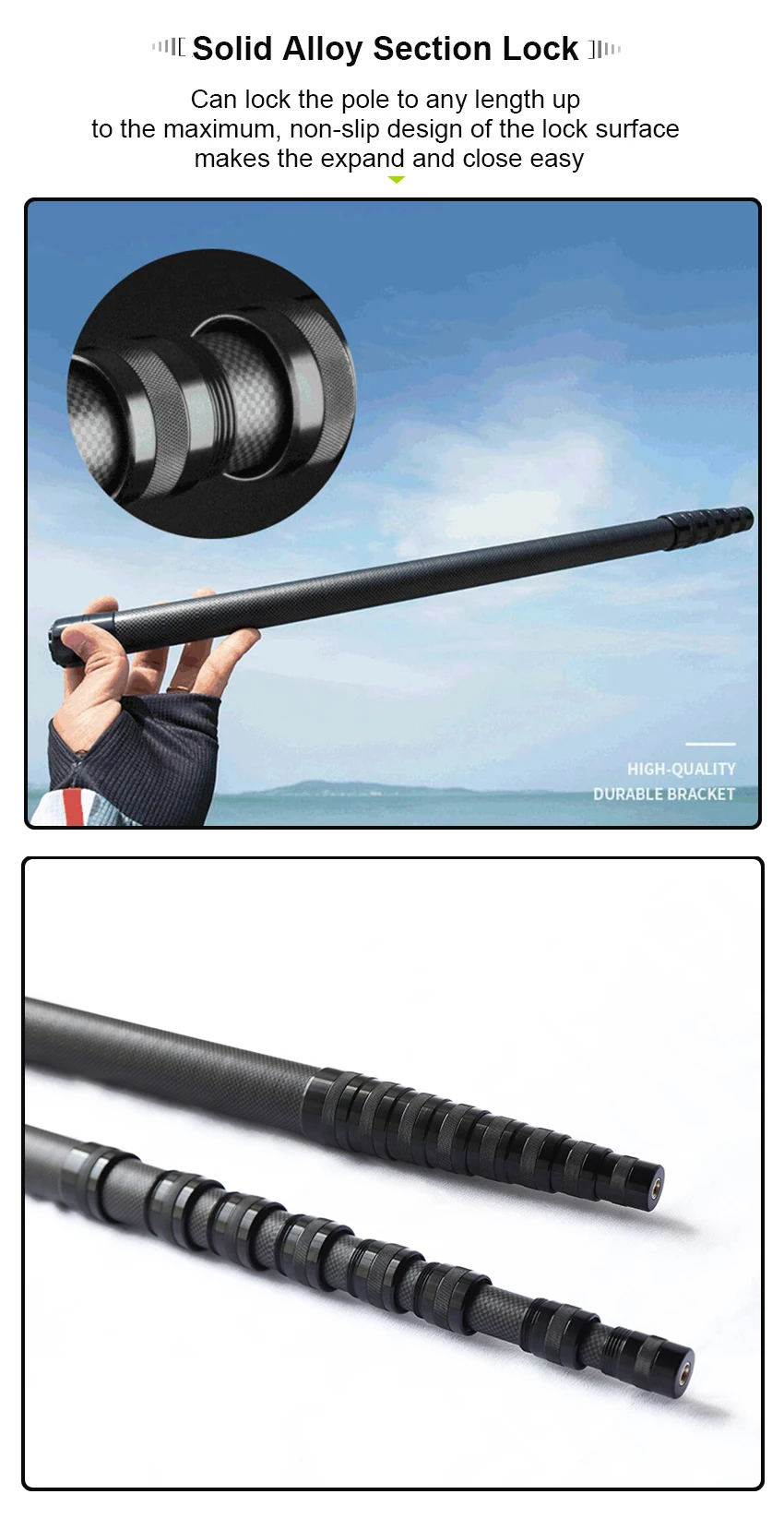 5. Bloqueo de sección de aleación sólida, puede bloquear el poste a cualquier longitud hasta el máximo, el diseño antideslizante de la superficie de bloqueo hace que la expansión y el cierre sean fáciles