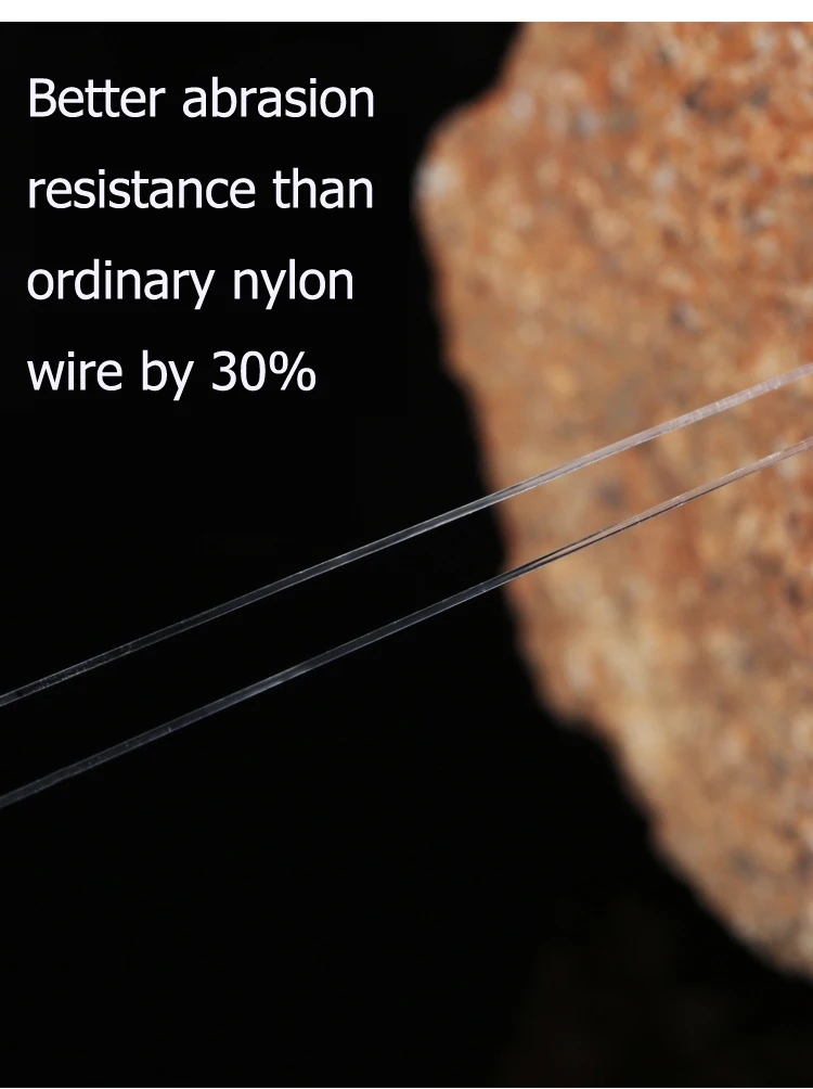 6. Las moléculas de nailon se unen firmemente para aumentar la tensión en la línea, un recubrimiento especial de fluorocarbono mantiene fuera las moléculas de agua, evita los tamaños de línea que no se hacen más grandes. El recubrimiento de fluorocarbono puede reducir la tensión del agua a la línea de pesca, y la línea de pesca entra en el agua rápidamente