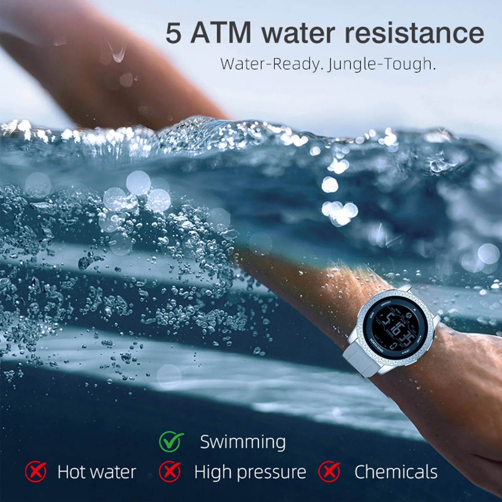 2.Protección contra el agua de 50 m: con una protección contra el agua de 50 m, este reloj digital es adecuado para nadar y otros deportes acuáticos, diseñado para funcionar en todo tipo de condiciones.