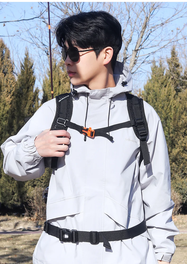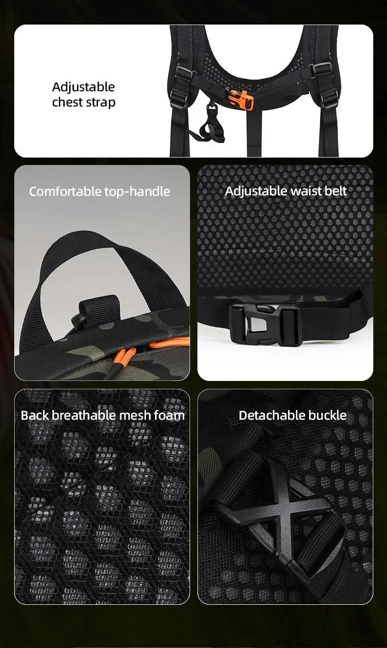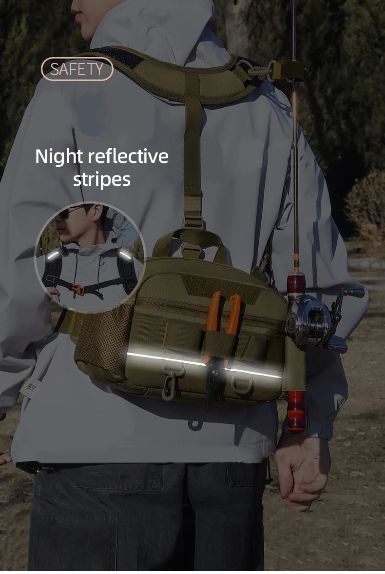 4. Tira reflectante: rayas reflectantes en la parte delantera de la mochila, mejorando efectivamente la seguridad de los viajes y la pesca nocturnos.