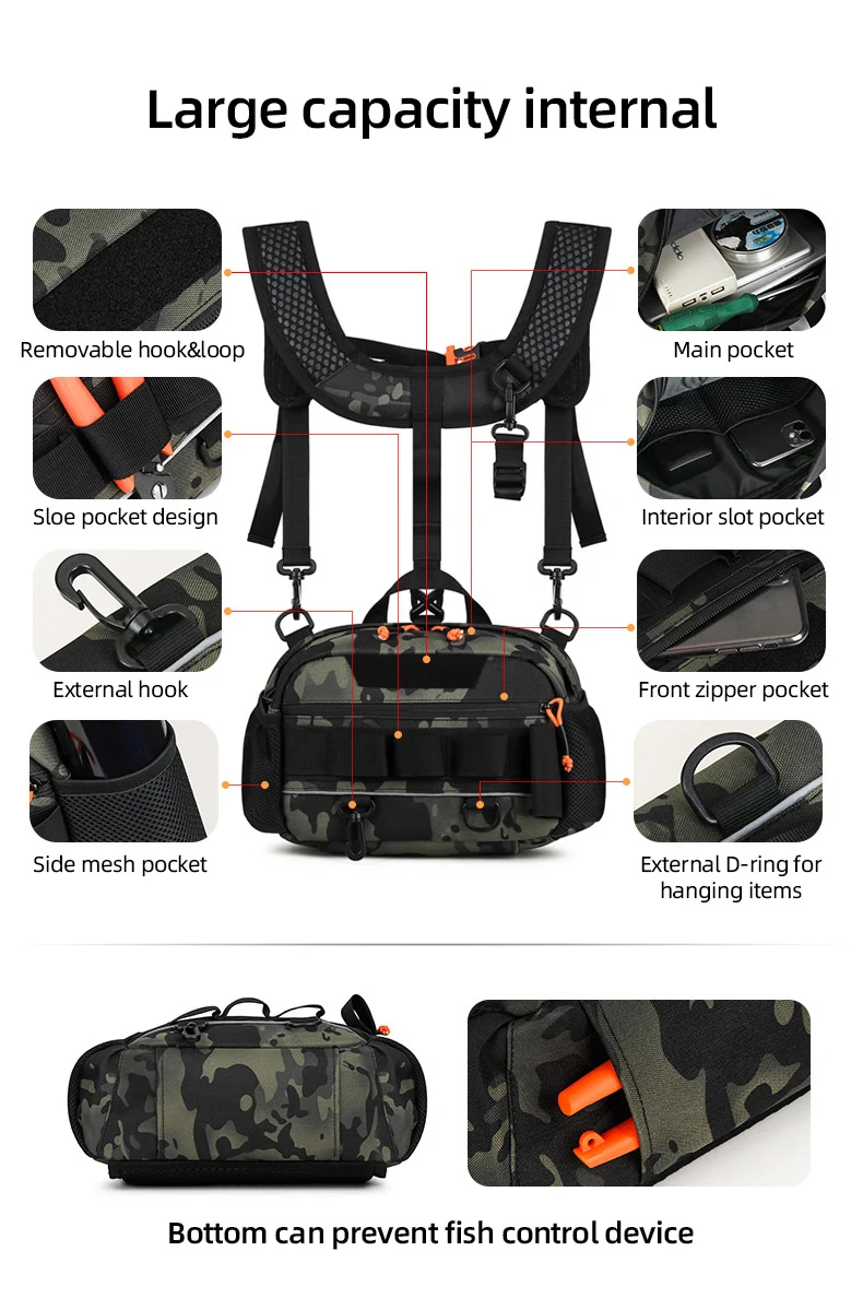 1. Múltiples compartimentos de almacenamiento de pesca: esta bolsa de pesca consta de 5 bolsillos con cremallera, 1 bolsillo para botella de agua y múltiples bolsillos con cierre de gancho y bucle para brindar mucho espacio organizativo.El diseño versátil con gran capacidad de bolsillos puede almacenar fácilmente cebos, alicates, líneas y otros accesorios que necesita en su vida, como teléfono celular, billetera, llaves, etc.