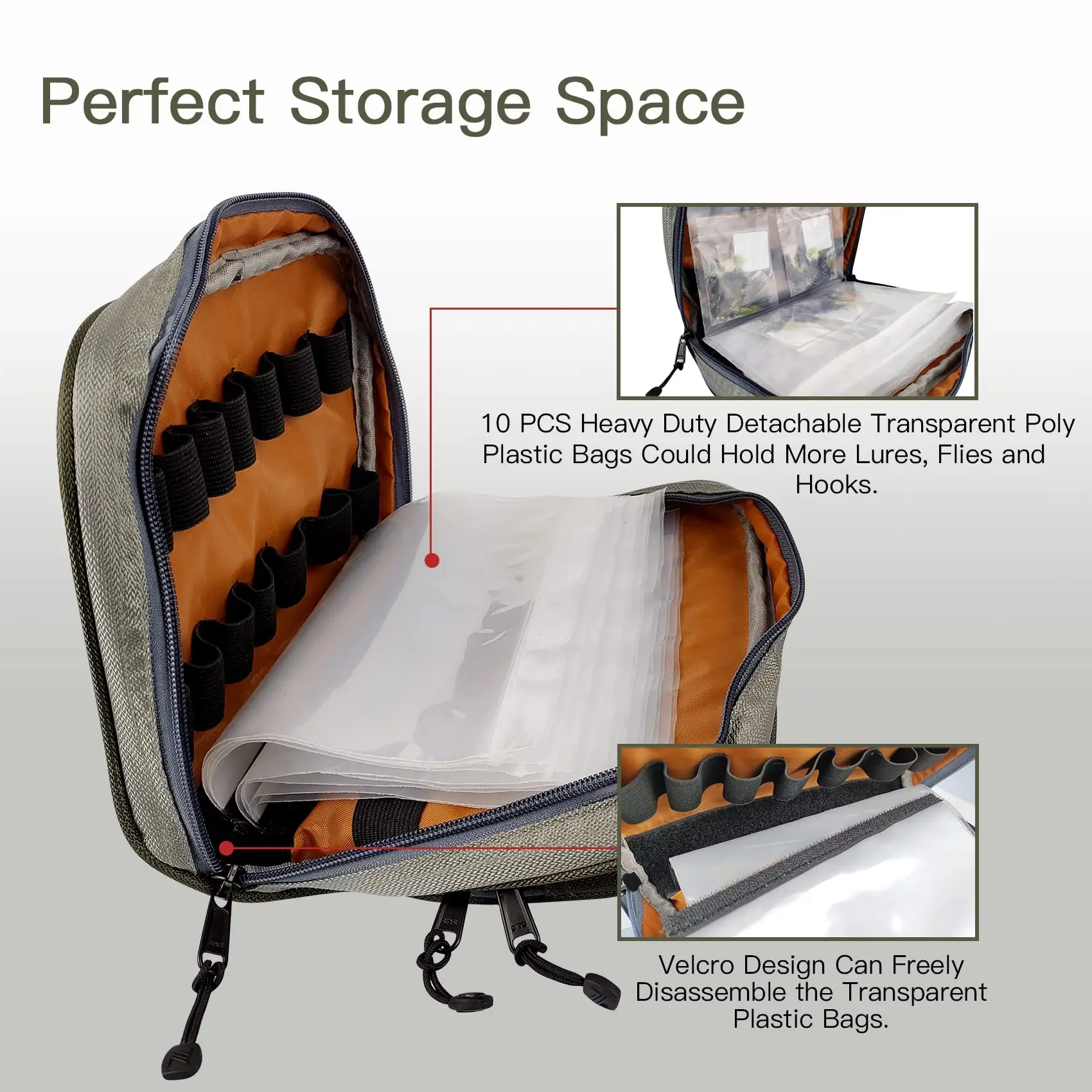 Eupheng fly tying bag has a main pocket and an outer pocket that open in opposite directions. There are 10 transparent bags in the main pocket. On one side of the main pocket, there are 14 black elastic bands for fly tying vises. On the other side of the main pocket, there are 32 small black elastic bands, which for holding different fly tying tools or accessories. The external pocket can hold a traveling vise pedestal or table clamp.