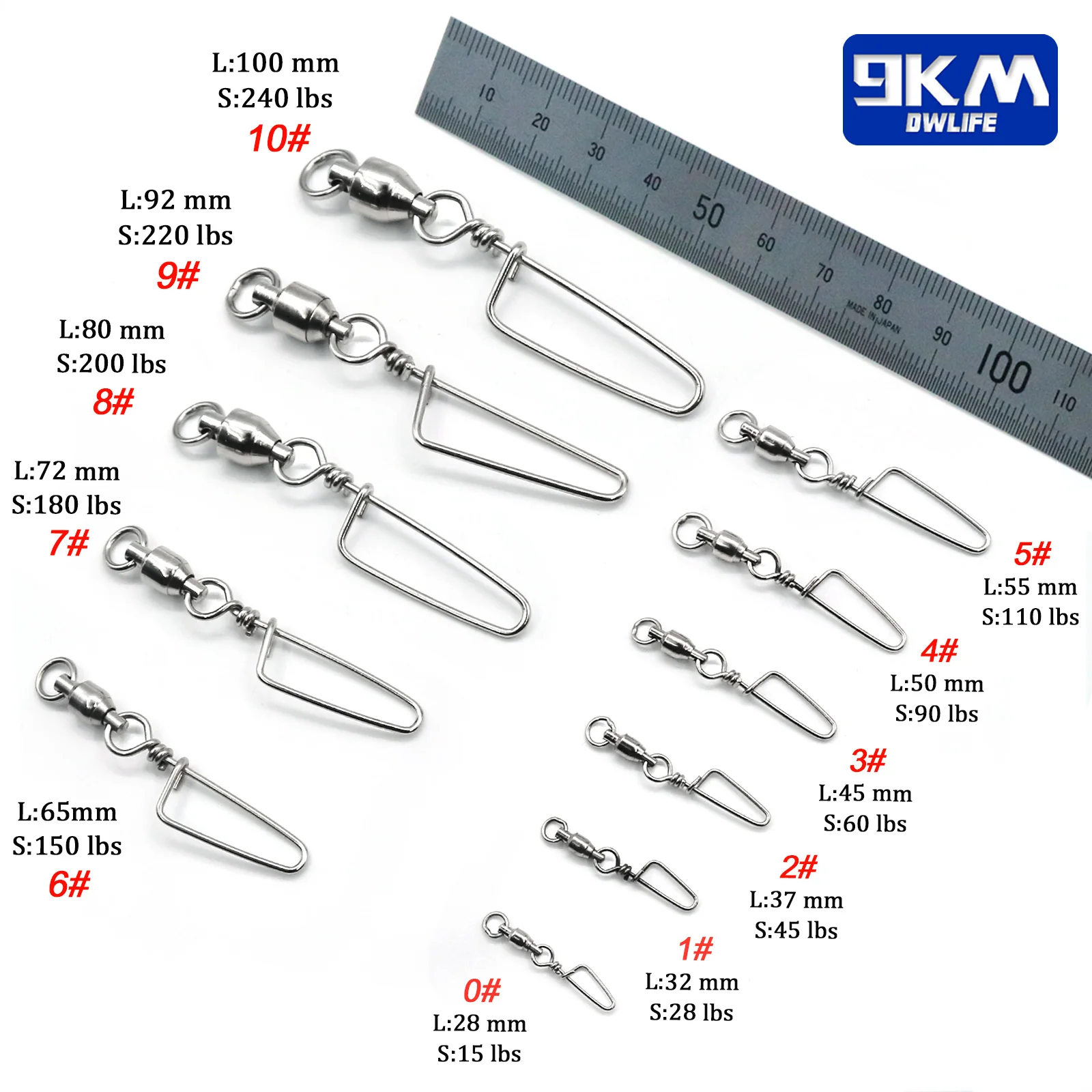 9KM Ball Bearing Fishing Snap Swivels: antioxidante, anticorrosión, resistente al desgaste, resistente a los impactos. Los anillos soldados sólidos pueden soportar trabajos pesados tanto en pesca de agua salada como de agua dulce. Los ganchos giratorios de pesca con cierre costero son fáciles de abrir y cerrar, lo que ahorra tiempo a los pescadores al cambiar los Señuelos de Pesca.