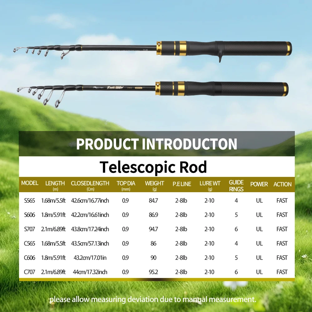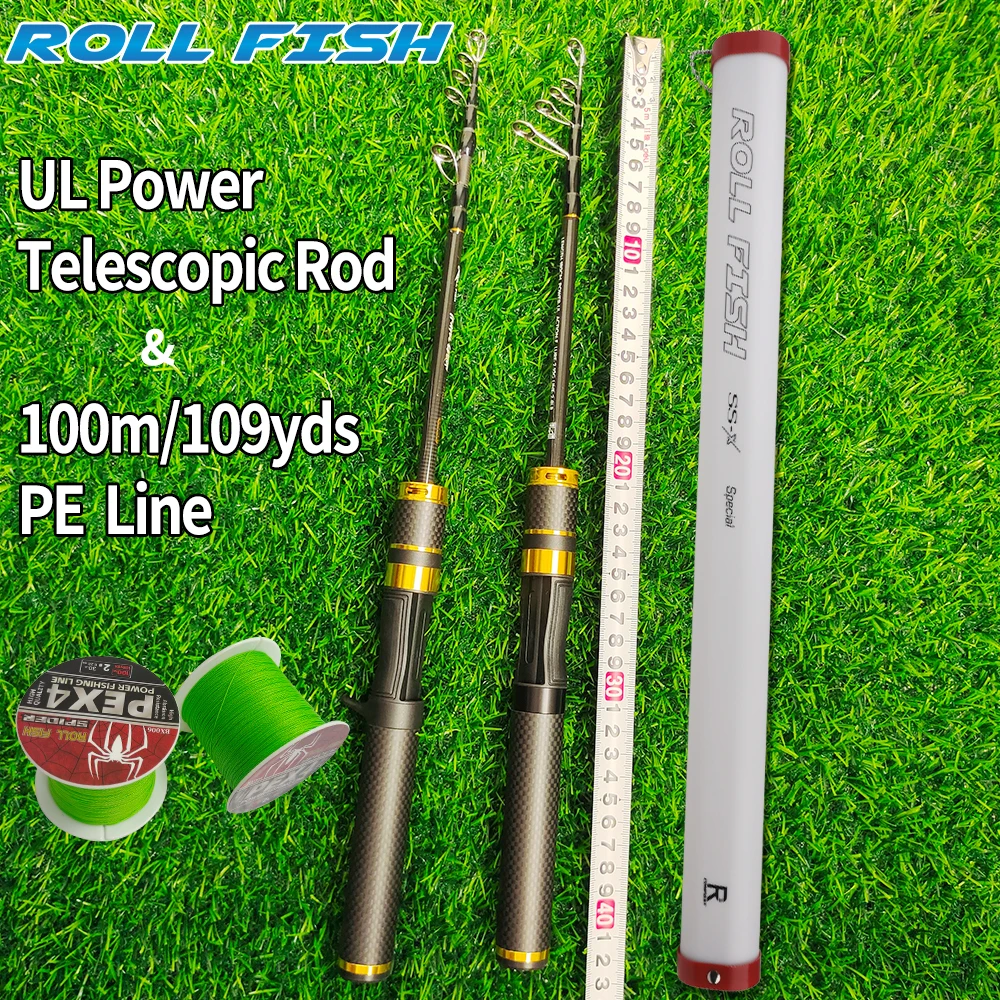 ROLLFISH-caña de pescar telescópica portátil de fibra de carbono para viaje, caña de pescar de fundición giratoria, acción UL, pesca de agua dulce ultraligera + línea de 100m