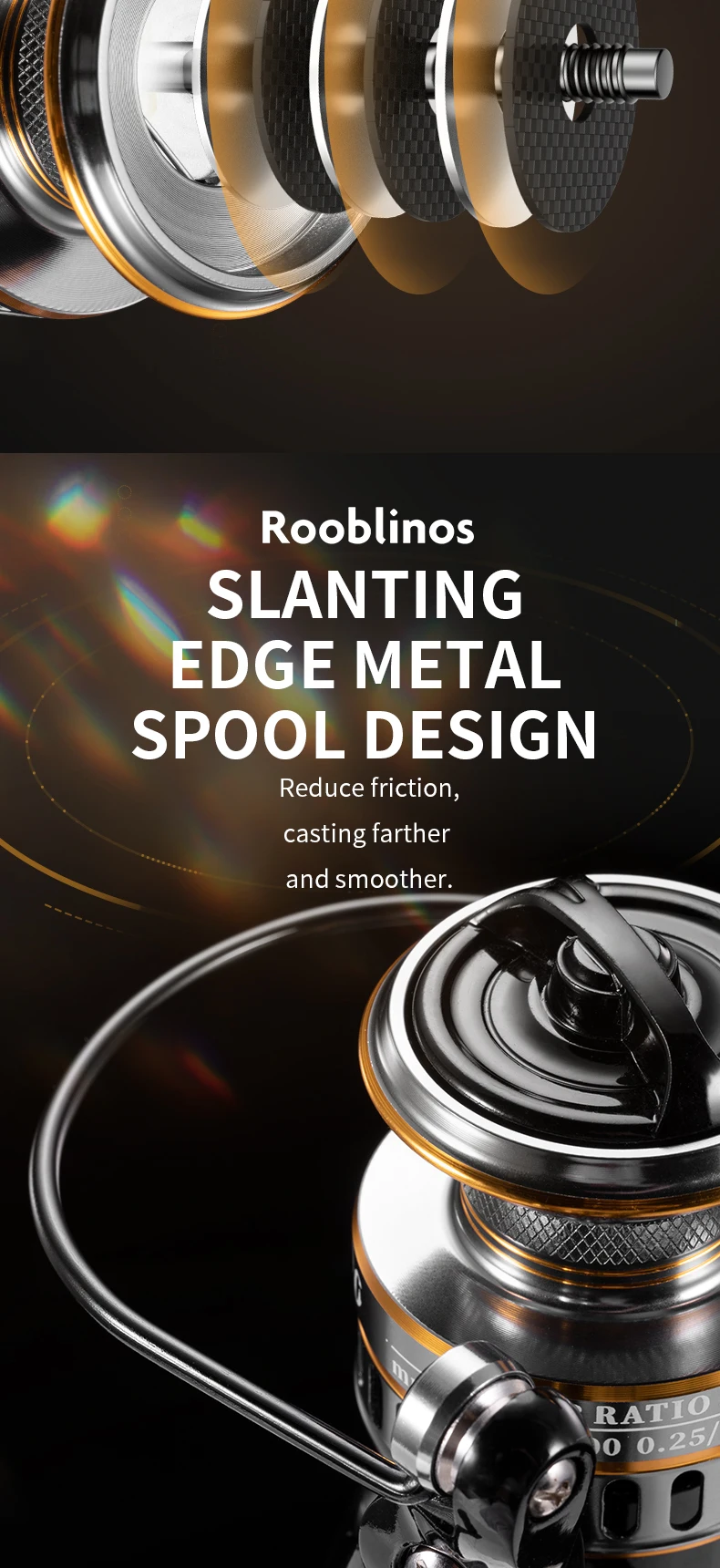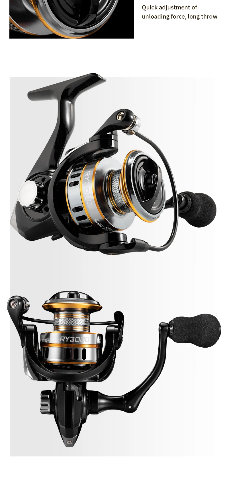 • Marco de metal ultraligero:El carrete de giro RY cuenta con un marco de metal ultraligero, asegurando durabilidad sin añadir peso innecesario. Esto lo hace ideal para largas horas de pesca sin fatiga.