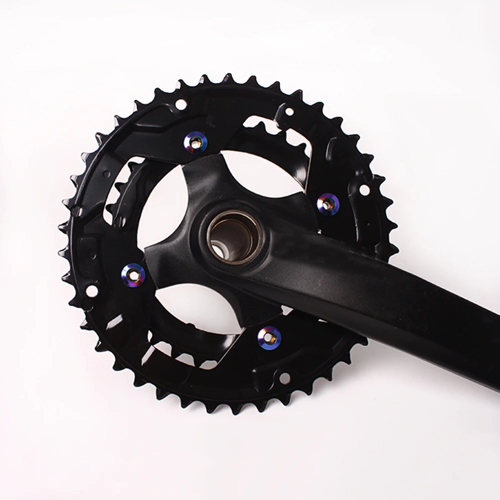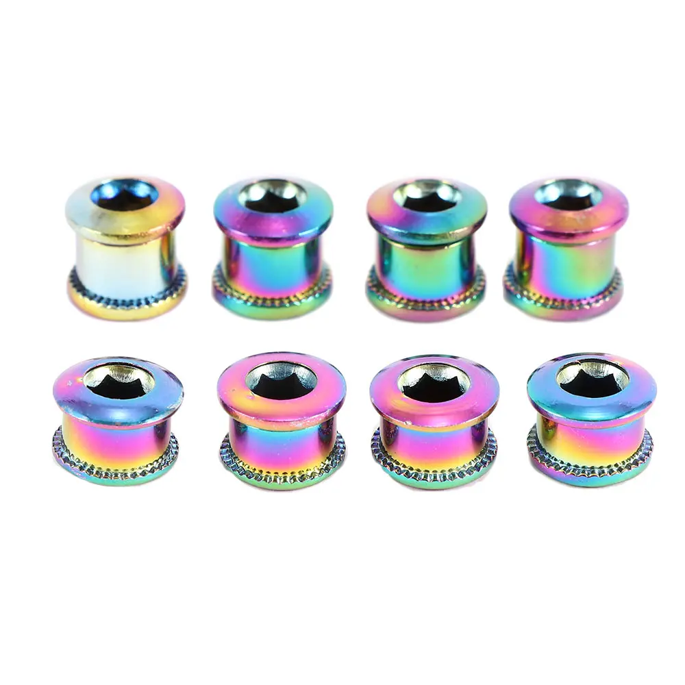 Material: acero inoxidable 304. Especificación: 6,5/8,5mm (para velocidad simple/doble). Peso: aproximadamente 5 g/pc. Cantidad: 4 pcs/set. Color: colorido. El paquete incluye: 4 tornillos de manivela de bicicleta. Características:. Tornillos de colores: chapado en titanio, más duradero a prueba de óxido, moda fresca Fácil de instalar, que es conveniente de usar. Comúnmente utilizado en bicicletas de montaña para bloqueo de disco de dos piezas. Ligero, resistente y duradero, se puede utilizar durante mucho tiempo. El color del chapado de titanio de cada perno de plato será un poco diferente.