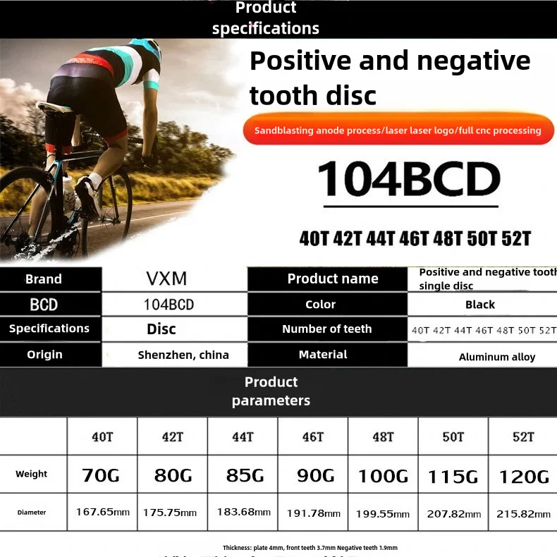 Rueda dentada para bicicleta, disco de dientes positivo y negativo, disco único para bicicleta de montaña, 104BCD, 40 T, 42 T, 44 T, 46 T, 48 T, 50 T, 52T