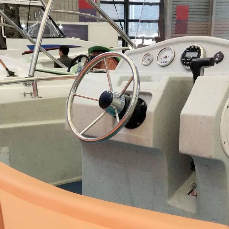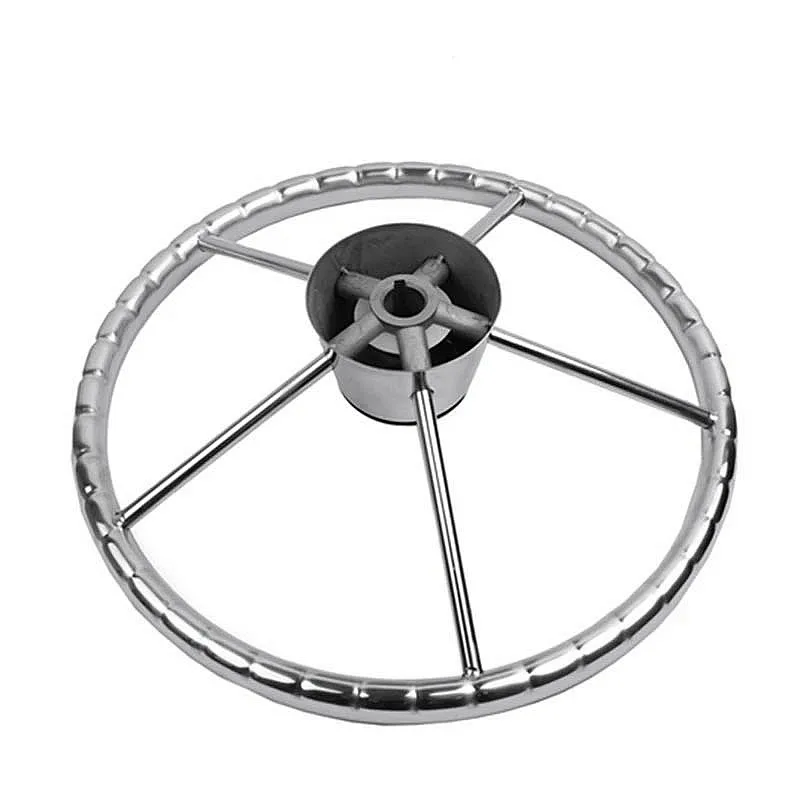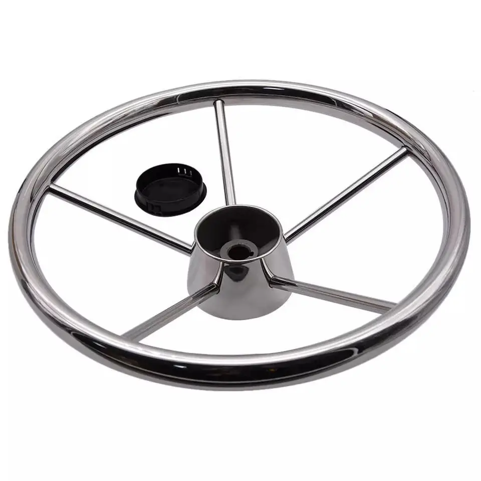 Volante marino de acero inoxidable 5 radios Material: acero inoxidable marino Acabado superficial: pulido espejo Medidas: 13-1/2 "de diámetro; 25 grados; 3/4" X 5 radios. * Eje cónico estándar de 3/4" * El embalaje incluye volante central y tapa negra.