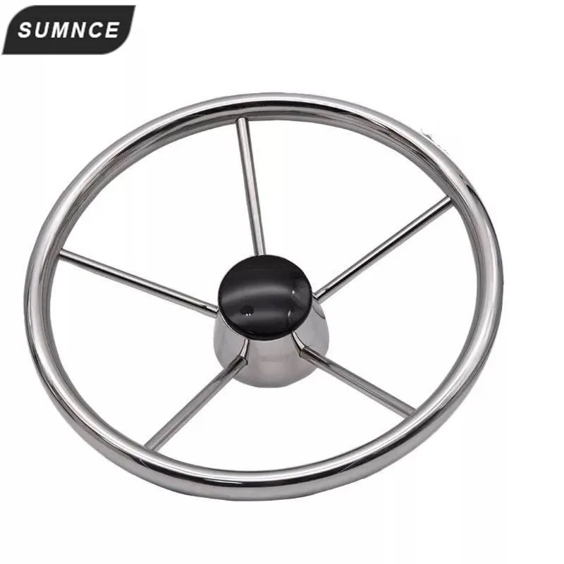 Volante marino de acero inoxidable 5 radios Material: acero inoxidable marino Acabado superficial: pulido espejo Medidas: 13-1/2 "de diámetro; 25 grados; 3/4" X 5 radios. * Eje cónico estándar de 3/4" * El embalaje incluye volante central y tapa negra.