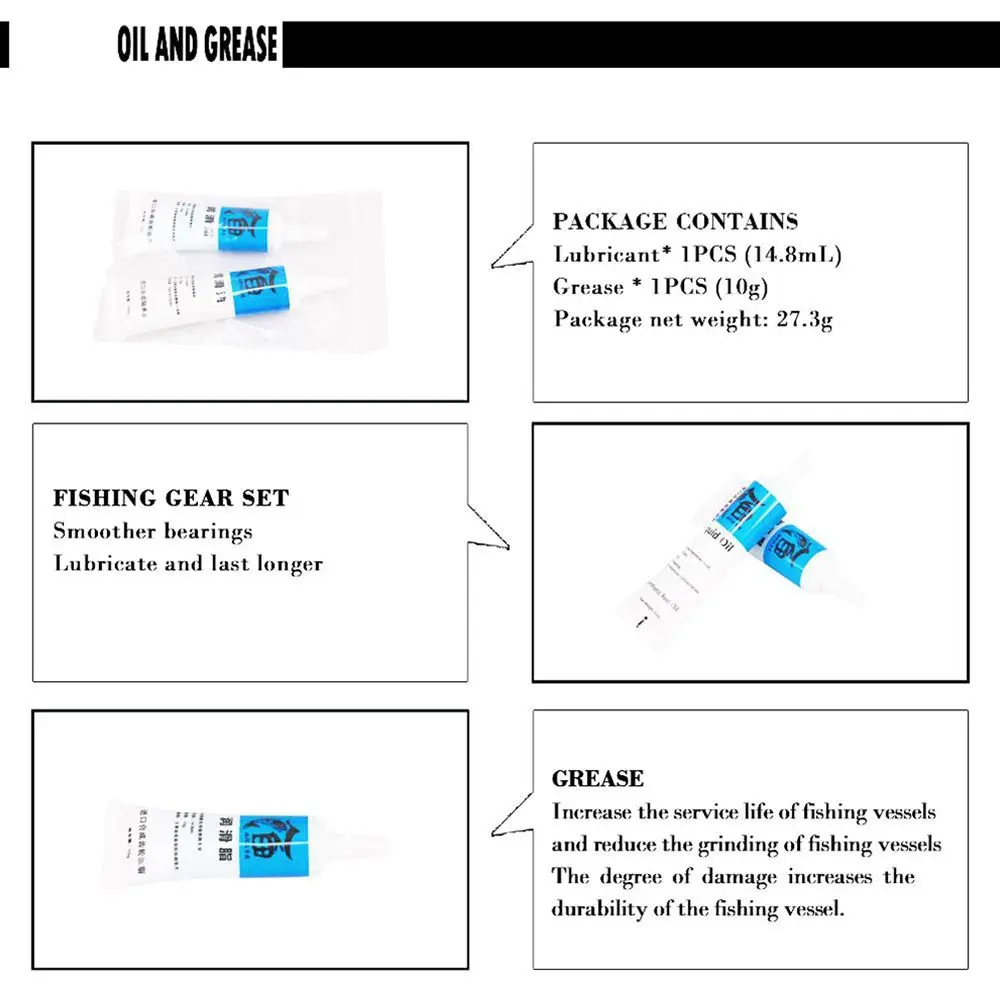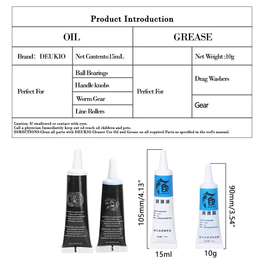 Color: Blanco, Negro Material: aceite graso Cantidad: 1 juego=1 pieza Grasa de carrete + 1 pieza Lubricantes de aceite de carrete: Utilizado para rodamientos de carrete o fricción. Grasa: para discos de engranajes de carrete de pesca y pastillas de freno. El paquete incluye: 1 unidad de grasa lubricante, 1 unidad de aceite lubricante. Nota: Por favor, tenga en cuenta el error que se debe a la medición manual. Por favor, asegúrese de que no le importa antes de pujar. Debido a la diferencia entre monitores, es posible que la imagen no refleje el color real del producto. ¡Gracias!