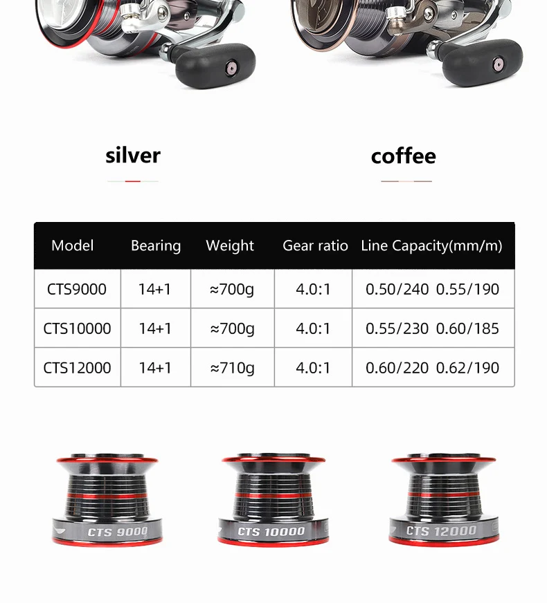 Rueda de pesca giratoria tiro largo, agarre goma suave 14 + 1BB 2023: 1, relación engranaje, bobina serie CTS 9000, 10000, 12000, 4,0