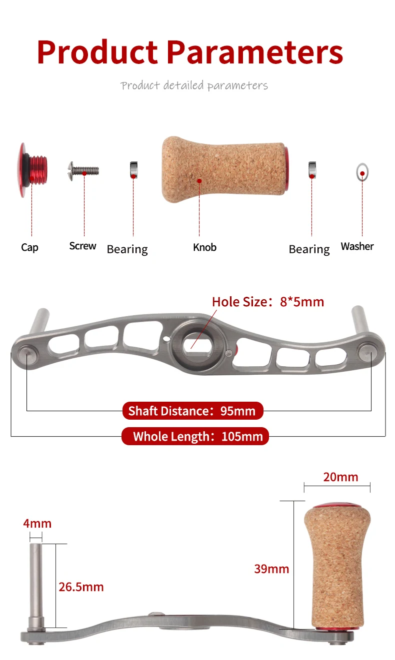 Ruke Fihing Reel Handle High Quality Strong Alloy Aluminum Fishing Reel Handle With Cork Knob For Baitcasting, Hole size 7*4/8*5mm