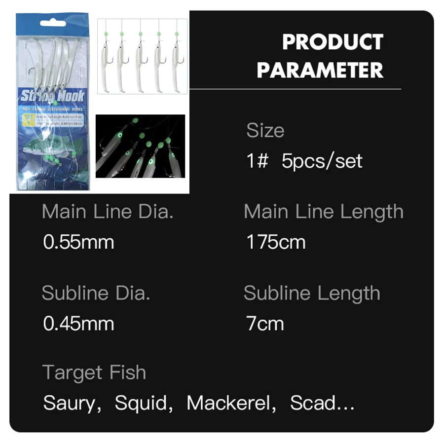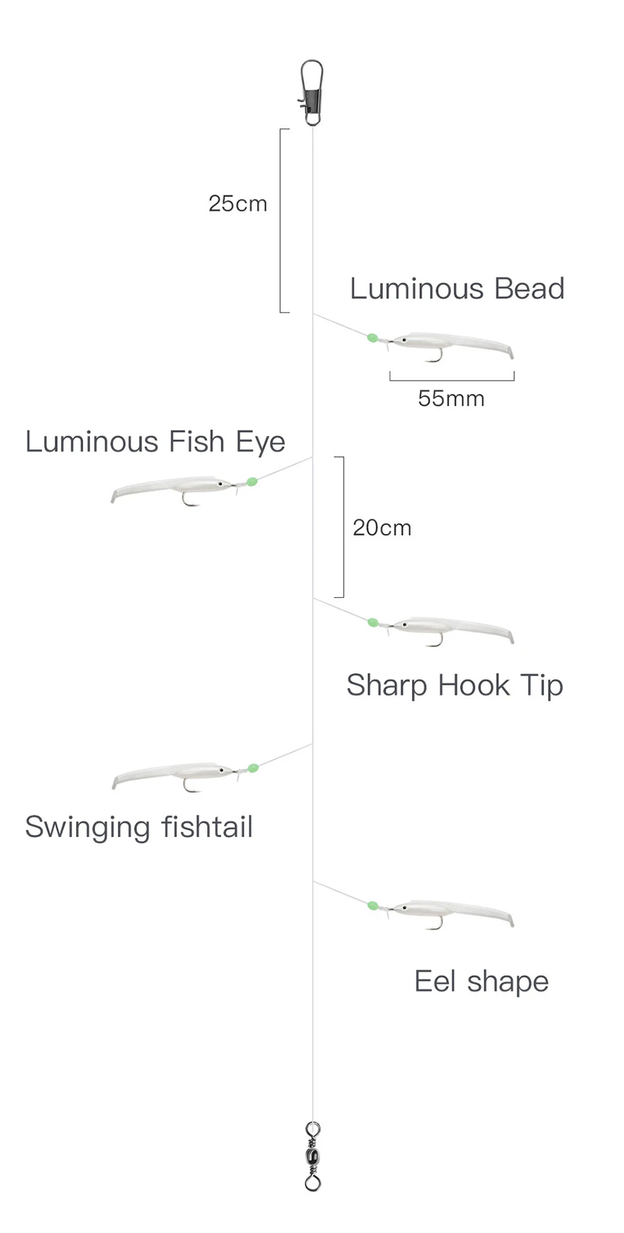 Sabiki Rigs Paquete de 4 aparejos de cebo de pesca suave Resplandor de tamaño mixto Aparejo de pesca Señuelos Anzuelos con rodamiento de bolas Conector giratorio