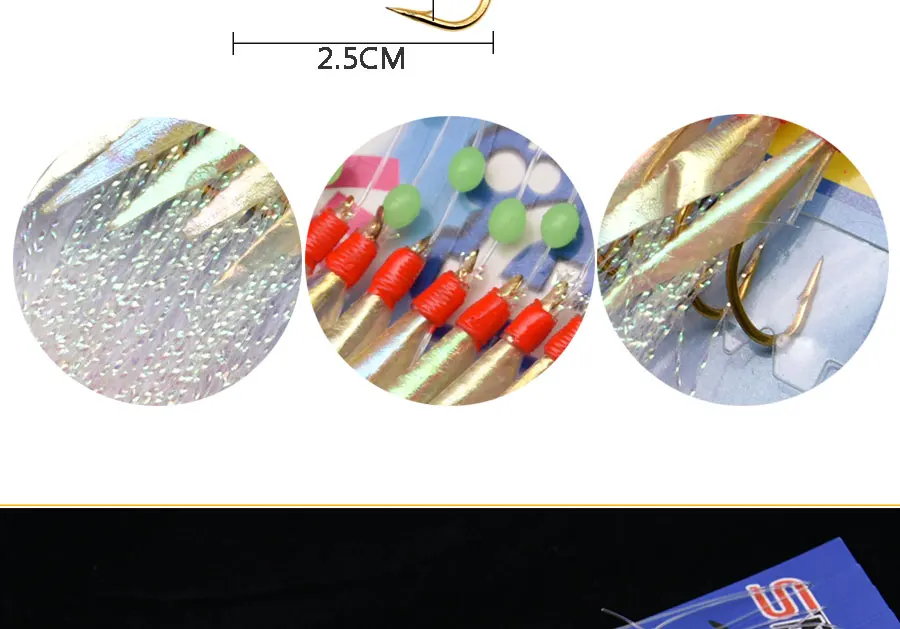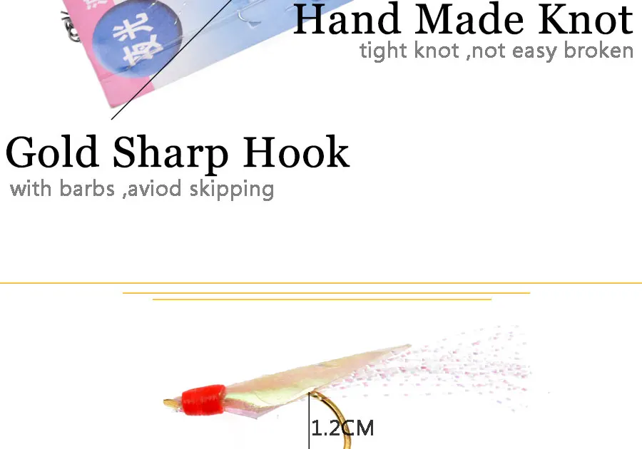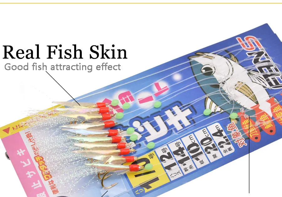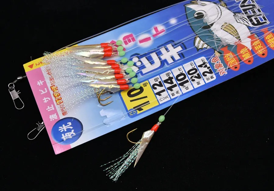 1. Utiliza piel de pescado real, el olor a pescado tiene un efecto de atracción de peces muy fuerte. 2. Anzuelo dorado luminoso apanese, atado firmemente a la línea de pesca 3. El hilo japonés bajo en carbono hace que el Gancho de cuerda sea difícil de anudar y fácil de operar 4. El uso de material de seda cruda Rosa atrae la atención de los peces, con cuentas luminosas, el efecto de pesca es excelente