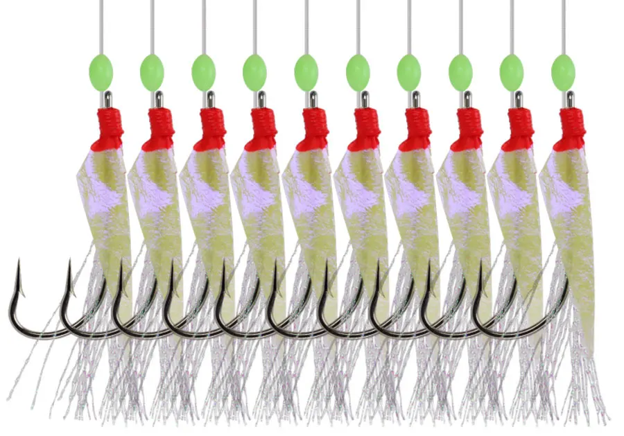 10 anzuelos de piel de pez Real, anzuelos de pesca largos sabiki samodur Rig para agua de mar cebo de pesca de natación en aguas profundas, para calamar, Saury, lubina