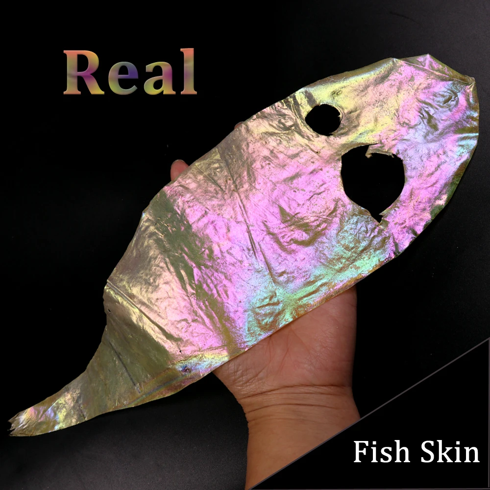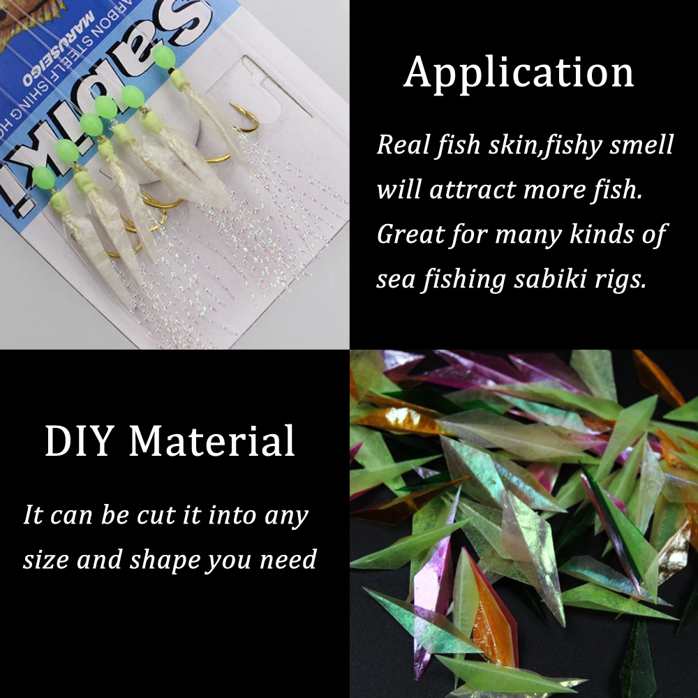 La piel de pescado real, olor a pescado, atraerá a más peces. Muy ideal para la fabricación de Señuelos de Pesca con mosca de agua salada, cebos sabiki, cubierta corporal de señuelo de camarón. Se puede cortar libremente en cualquier tamaño y forma que necesite.