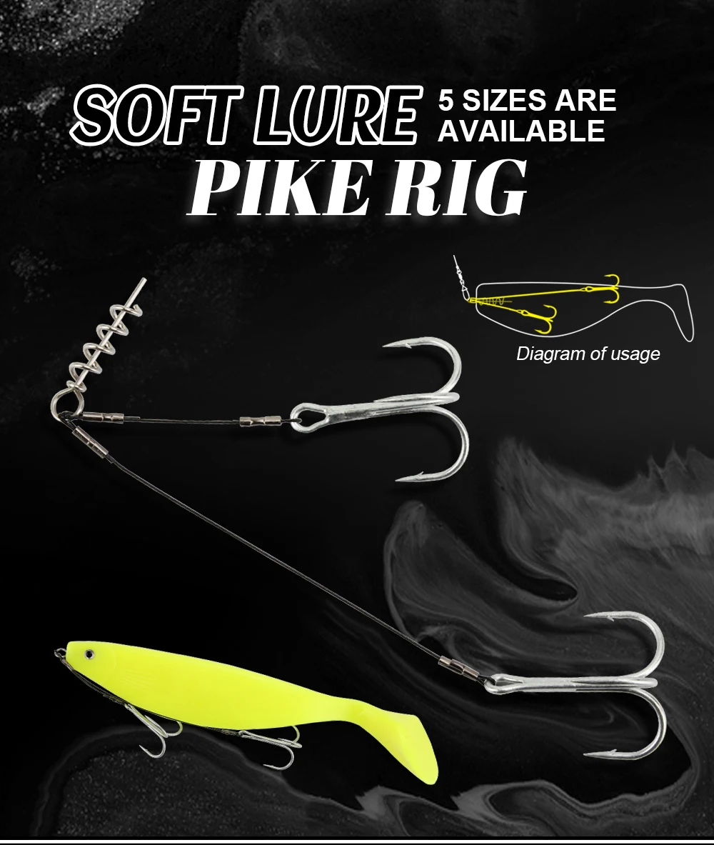 Al pescar lucio grande con montaje de cebos blandos aumenta la cantidad de golpes y anzuelos exitosos, gracias a la flexibilidad de colocar los anzuelos en diferentes lugares del cuerpo del cebo, manteniendo el máximo equilibrio y su juego.