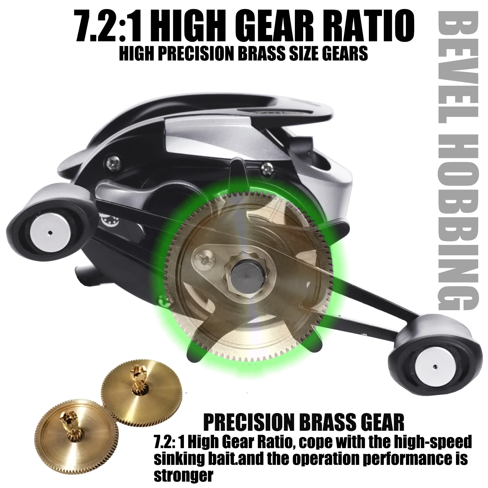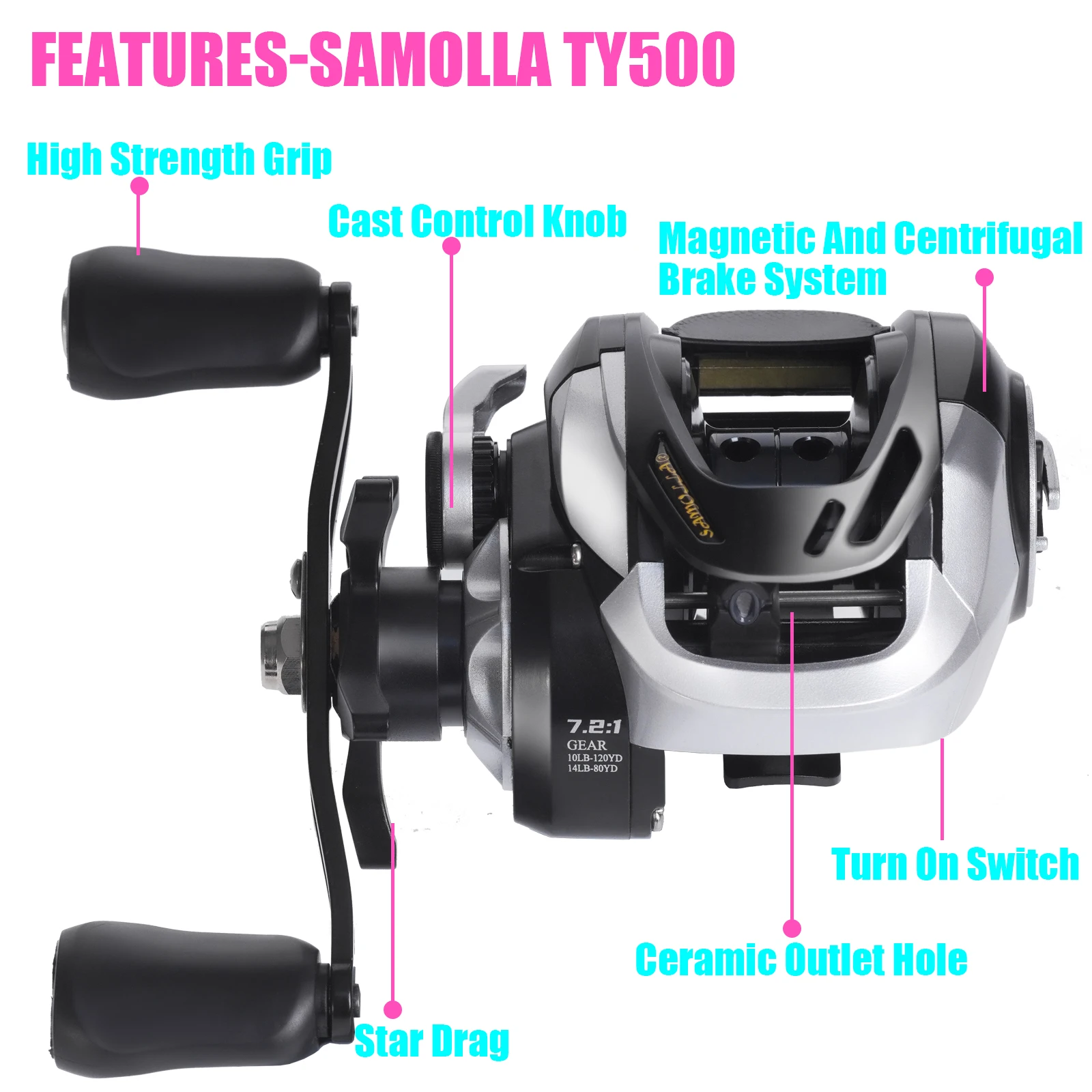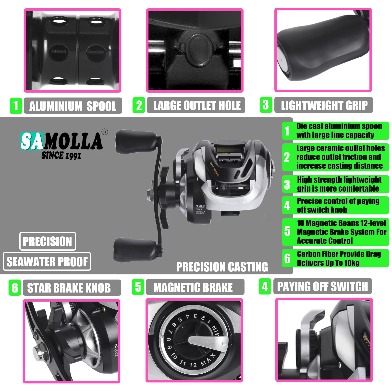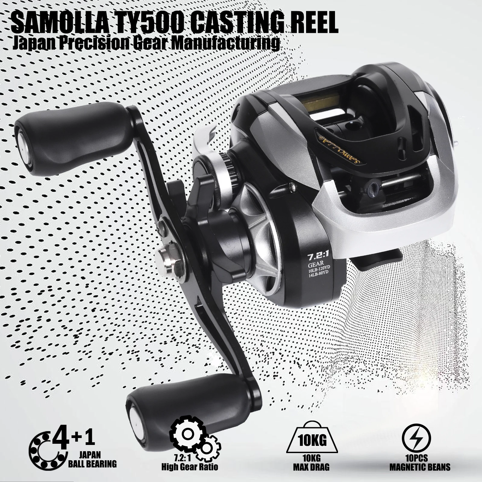 SAMOLLA-carrete de pesca Baitcasting, frenos magnéticos y centrífugos, presión de sonido de clic 7,2: 1, 10kg, impermeable, agua salada