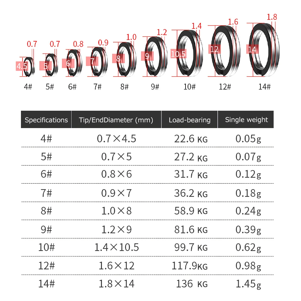 2. Ajuste preciso y de varios tamaños: cubriendo 4#, 5#, 6#, 7#, 8#, 9#, 10#, 12# y otras especificaciones, sin importar el tipo de anzuelos, señuelos o grupos de pesca que combine, puede encontrar con precisión los anillos divididos más adecuados para satisfacer las necesidades de escenarios de pesca diversificados.