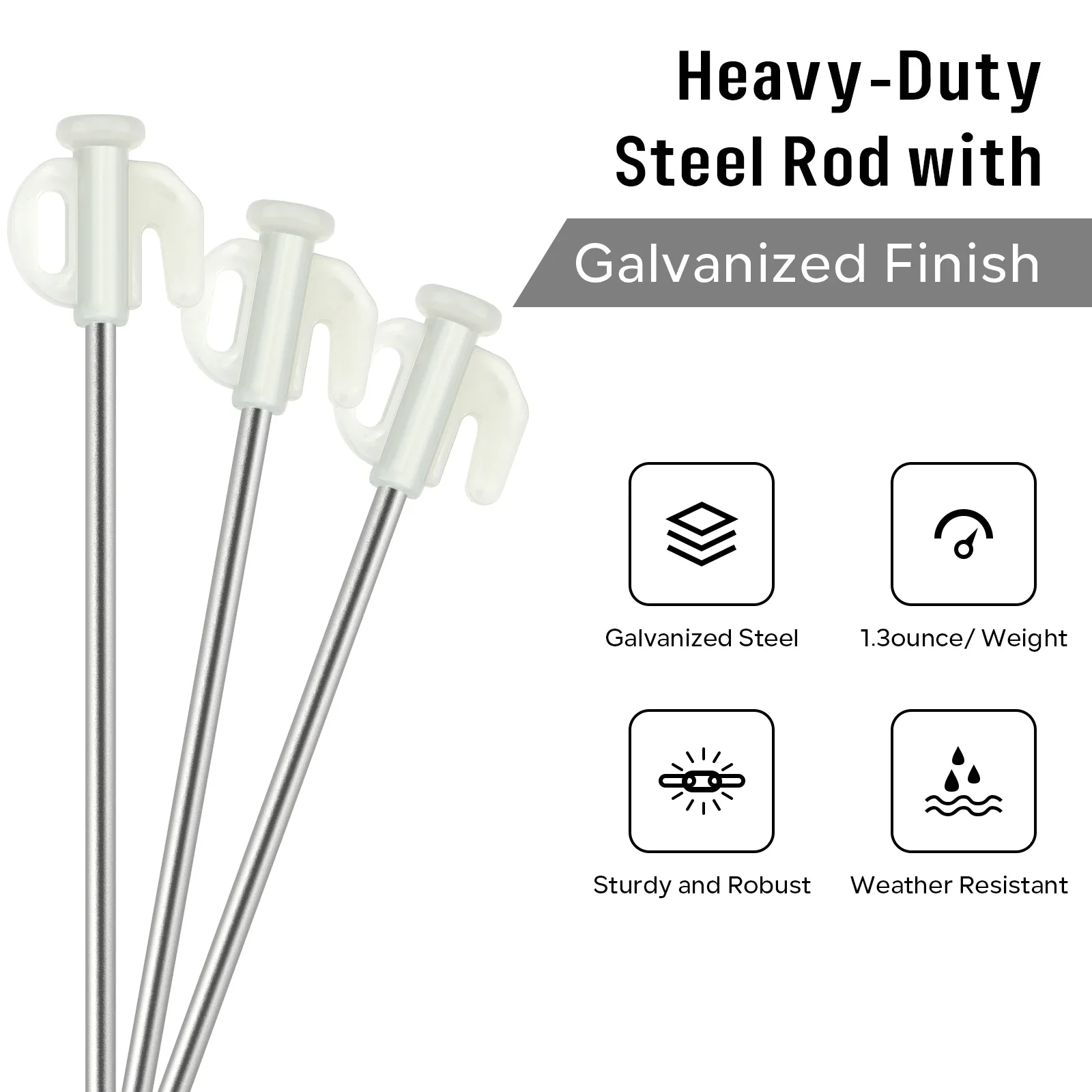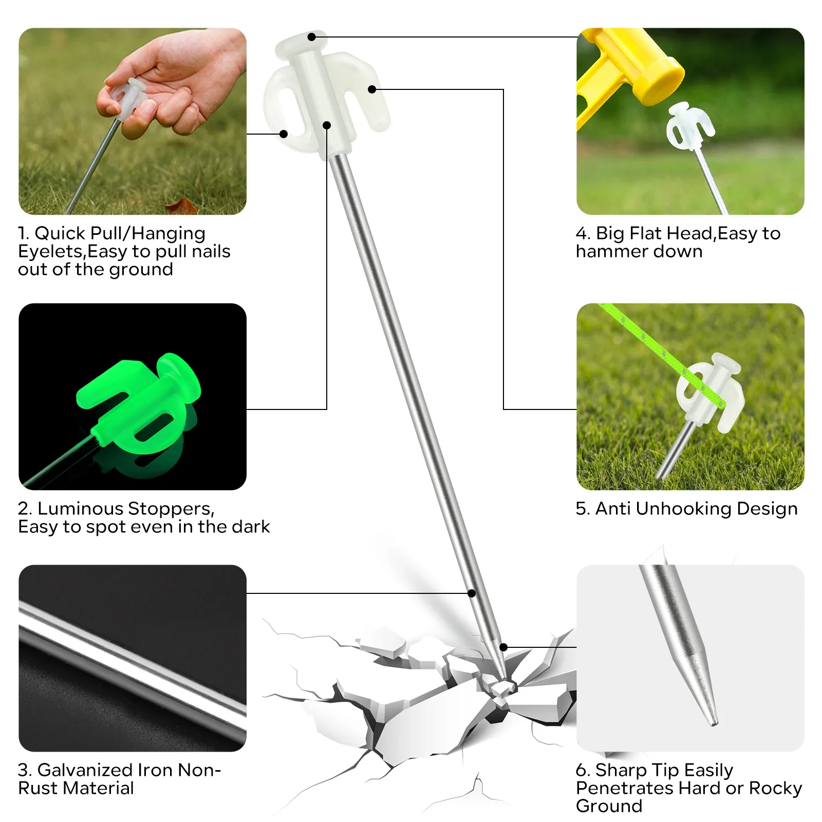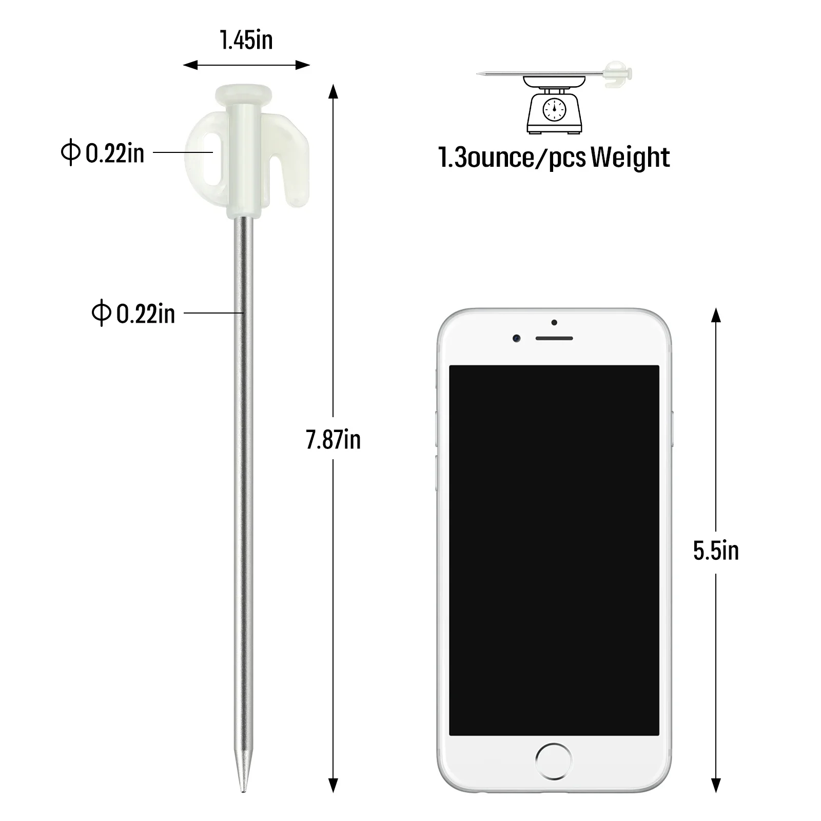 4.[Tamaño] Longitud de los pasadores: 20 cm, Diámetro: 0,58 cm, Peso: 45 g/unidad, 20 piezas en total, bien diseñado para garantizar la estabilidad y penetración del producto, además de ser fácil de transportar y usar.La pila es larga y grande con un agarre fuerte, adecuada para acampar al aire libre.