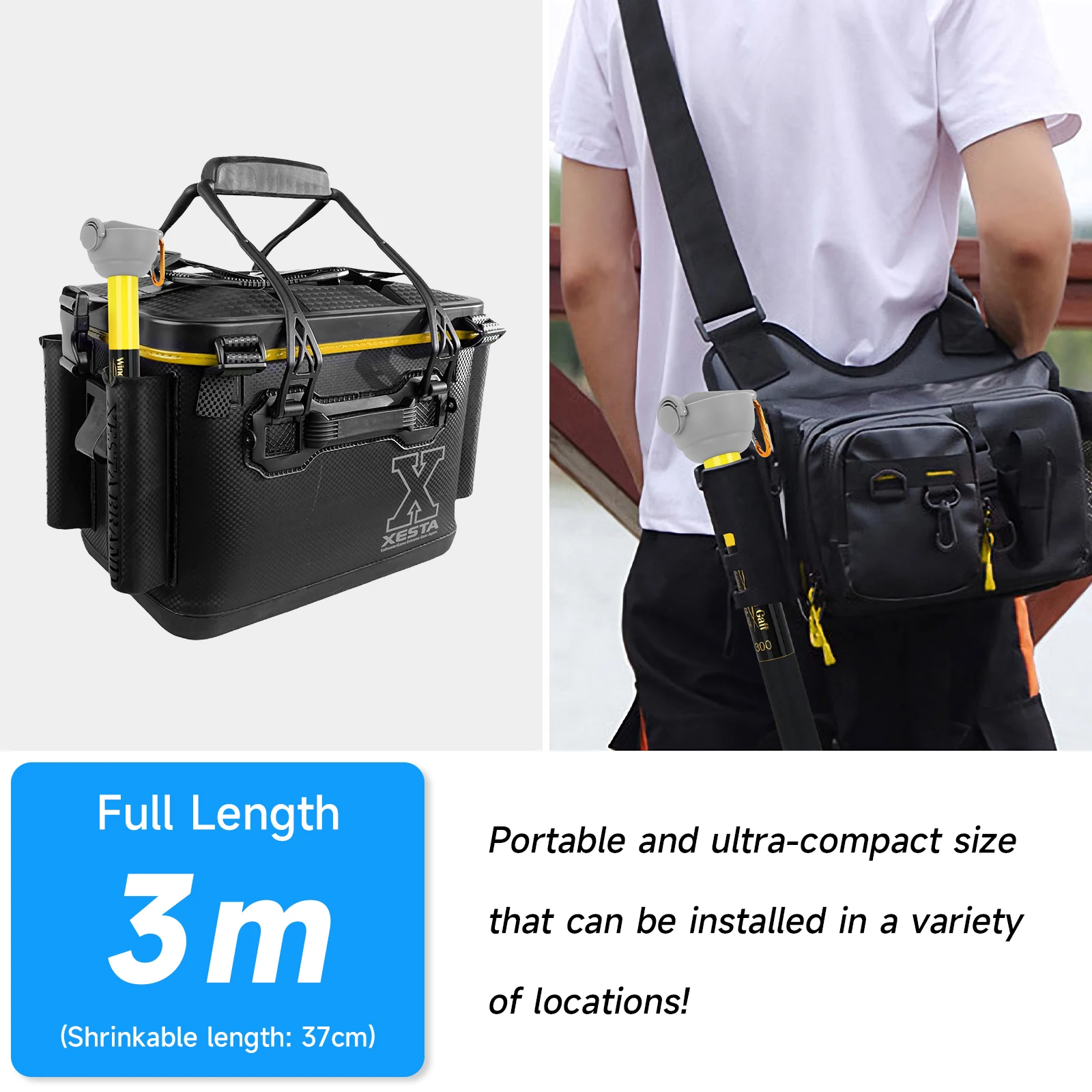 Se extiende hasta 3 metros y se encoge sólo 37 cm.El diseño de sección corta de 11 secciones se puede guardar directamente en una mochila/bolsa de equipo de pesca.Es muy cómodo de llevar cuando se viaja y se pesca en el mar, y no ocupa espacio.