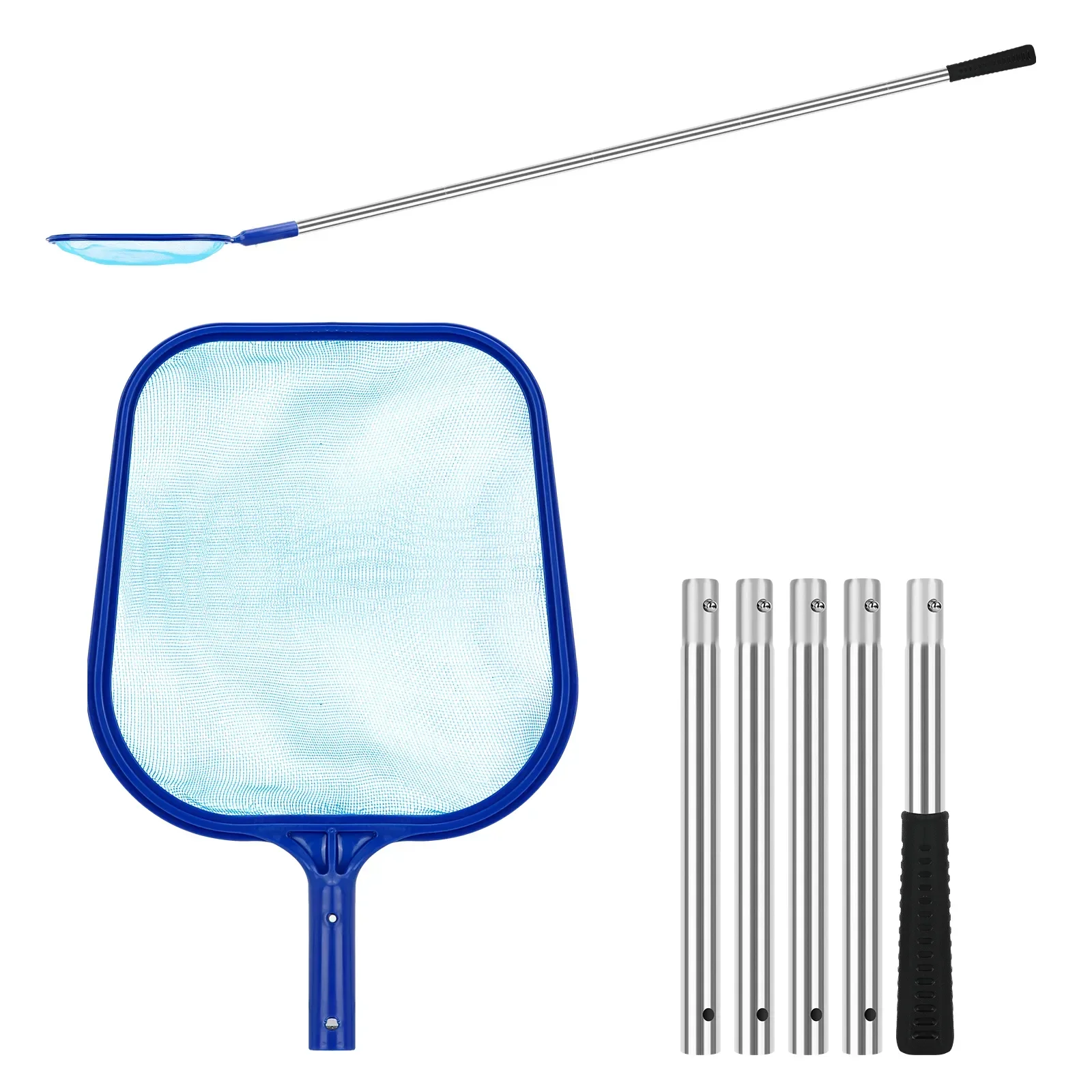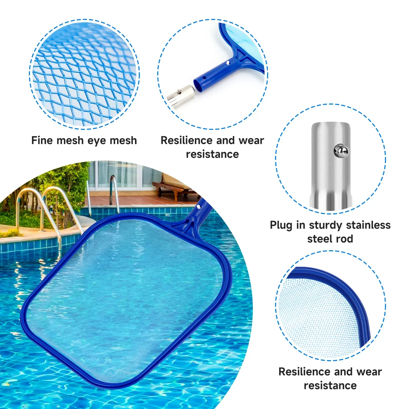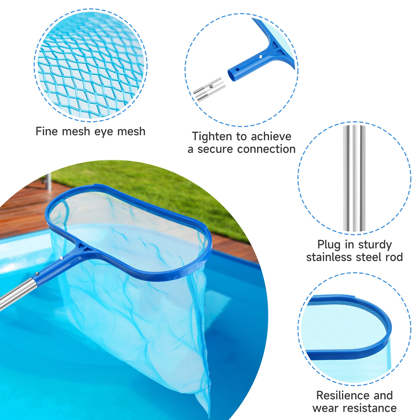 Este juego de limpieza de piscinas premium incluye un poste de piscina de acero inoxidable ajustable de 60,2 pulgadas y una red rastrillo para skimmer de piscina de malla fina.El rastrillo para piscina de calidad profesional garantiza una eliminación rápida, sin esfuerzo y altamente eficiente de hojas y escombros de la piscina, lo que reduce significativamente el tiempo y el esfuerzo de limpieza.