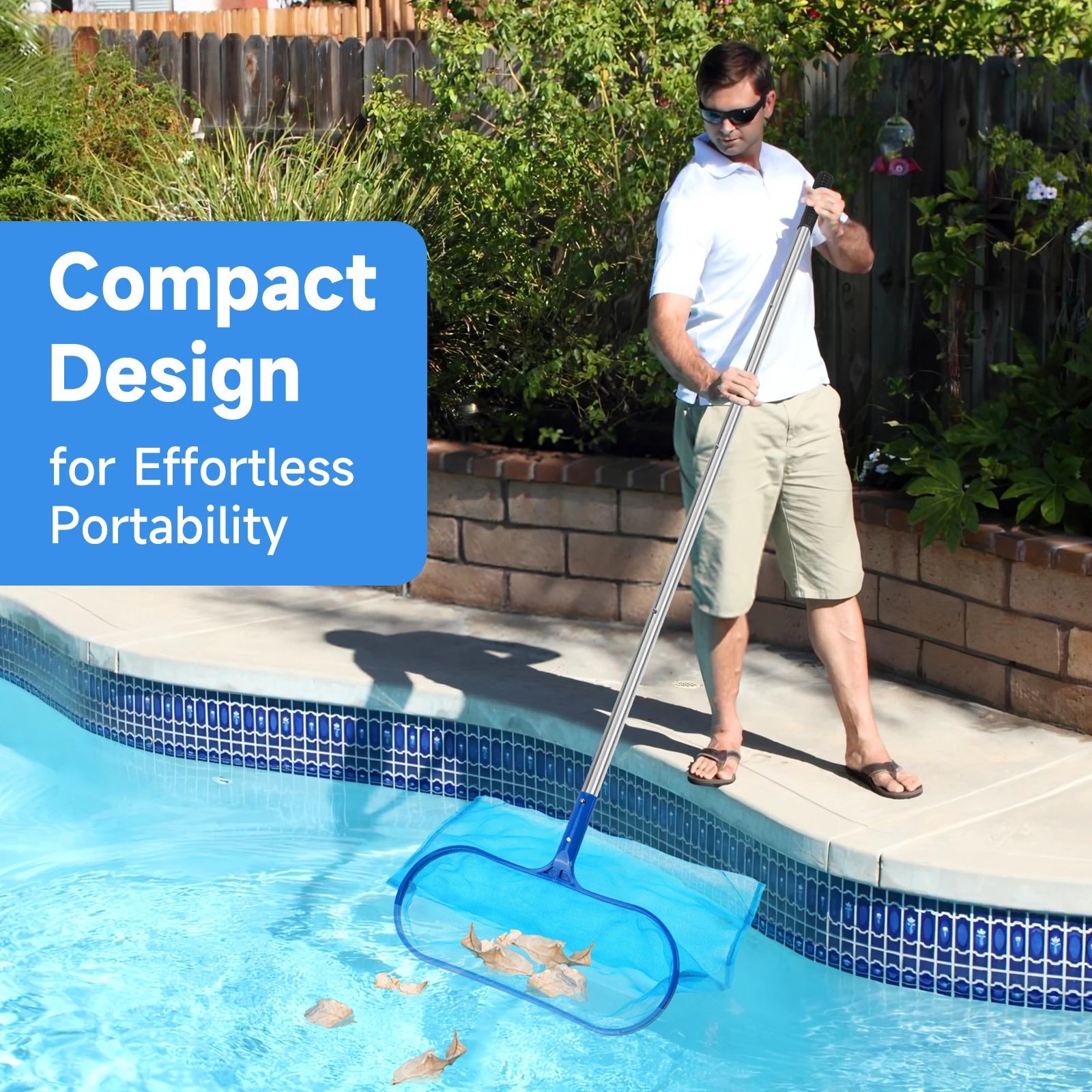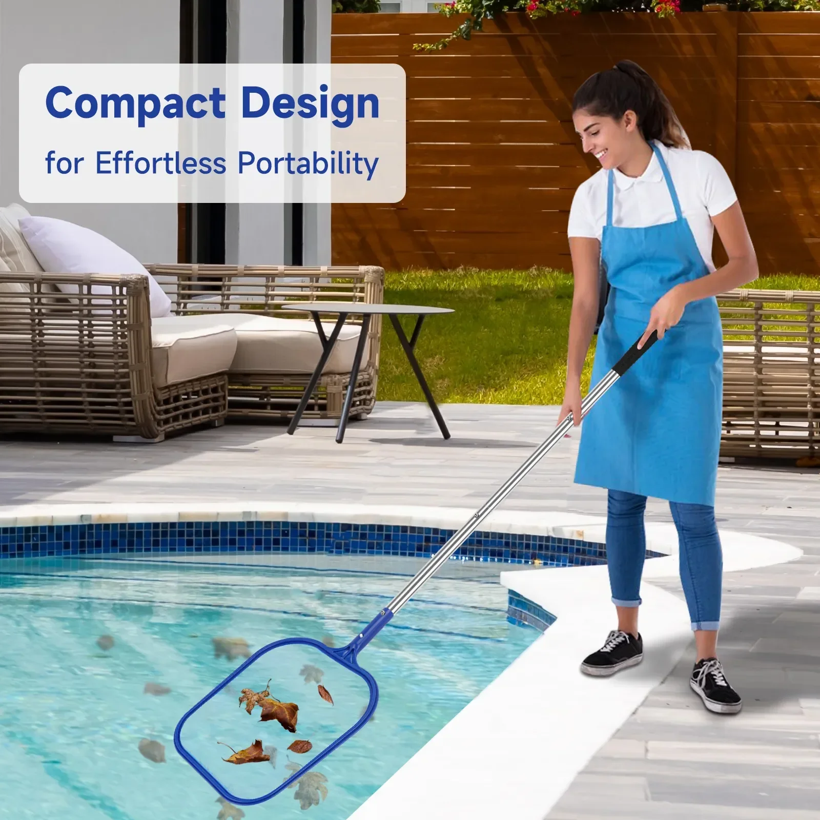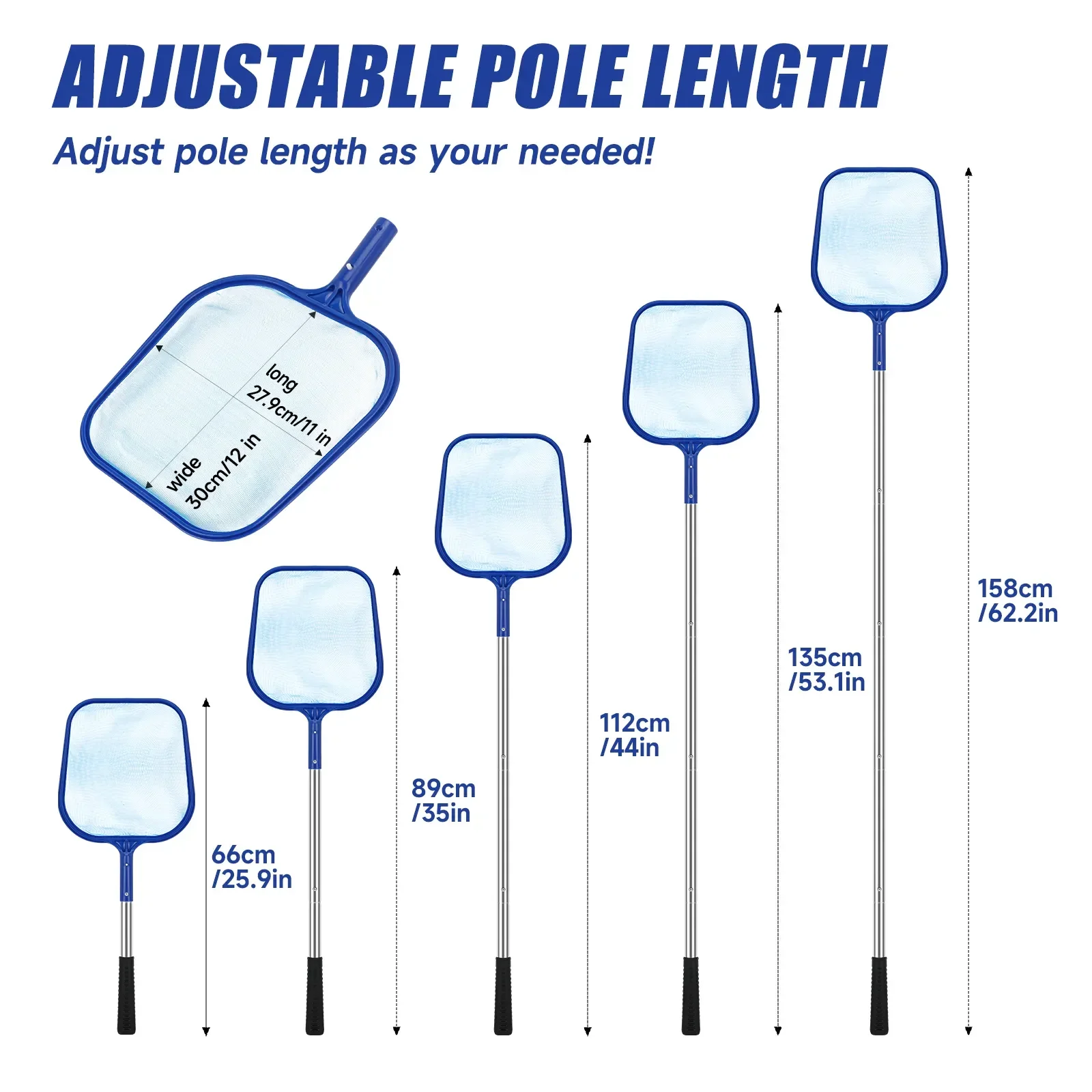 Este juego de limpieza de piscinas premium incluye un poste de piscina de acero inoxidable ajustable de 60,2 pulgadas y una red rastrillo para skimmer de piscina de malla fina.El rastrillo para piscina de calidad profesional garantiza una eliminación rápida, sin esfuerzo y altamente eficiente de hojas y escombros de la piscina, lo que reduce significativamente el tiempo y el esfuerzo de limpieza.