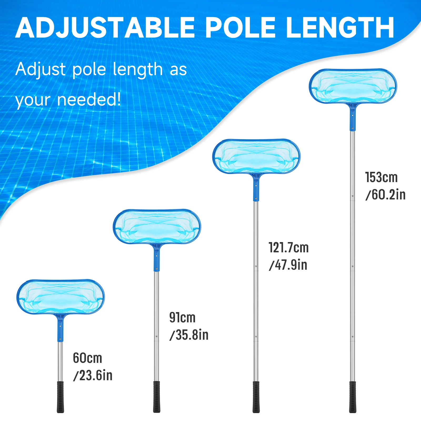 El poste de la piscina está hecho de acero inoxidable resistente y robusto.La conexión superpuesta de cada sección de aluminio se ha mejorado para mayor resistencia.Con una longitud ajustable que oscila entre 23,6 y 60,2 pulgadas, permite una limpieza integral desde todos los ángulos de la piscina.