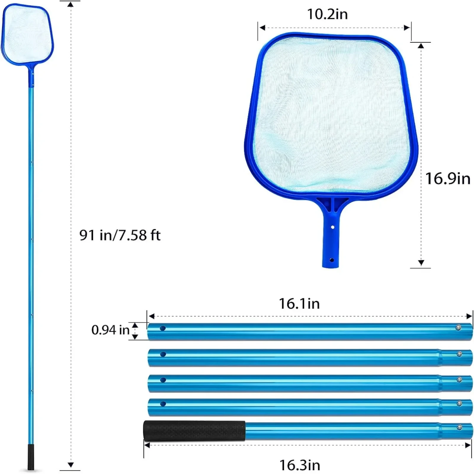 1.[Poste de aluminio de alta calidad] Diseño de poste desmontable de 5 secciones.La combinación más larga es de 231,14 cm/91 pulgadas/7,58 pies y la combinación más corta es de 118,11 cm/46,5 pulgadas/3,8 pies.Esta herramienta de limpieza que ahorra espacio es perfecta para piscinas de varios tamaños elevadas.