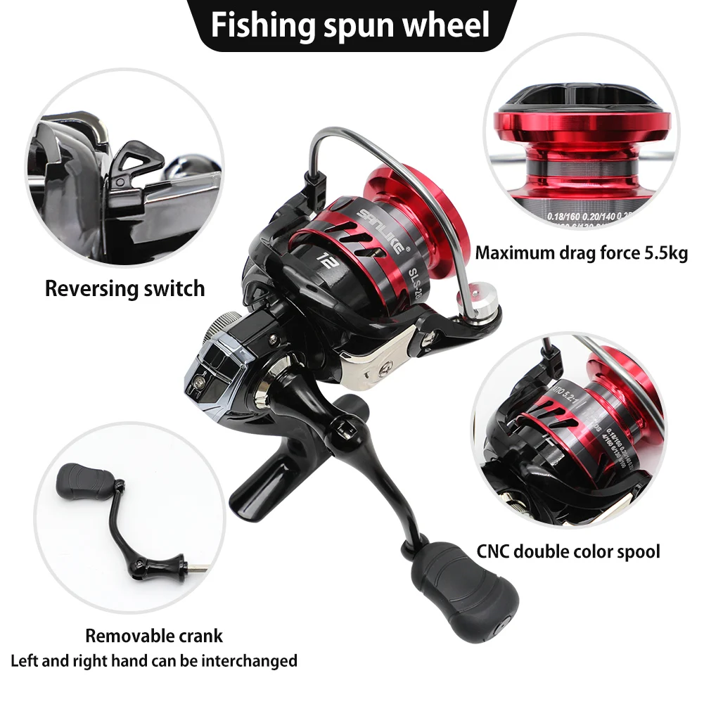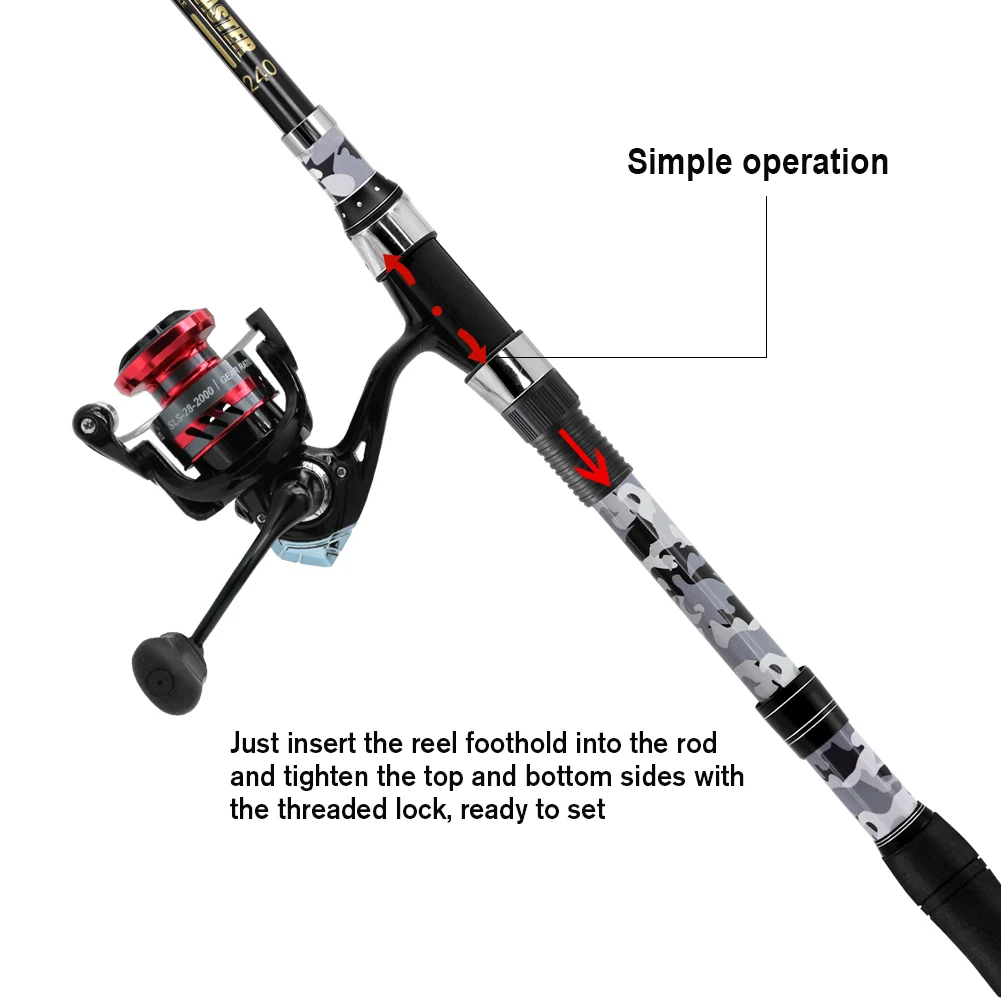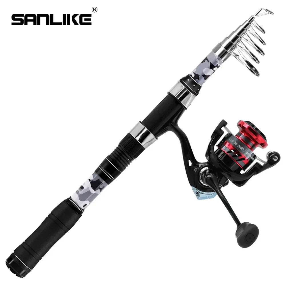 SANLIKE, juegos de caña de pescar y carrete, caña de pescar telescópica de fibra de carbono de 2,4 M, 5,2: 1, relación de engranaje, organizador giratorio, juego de postes