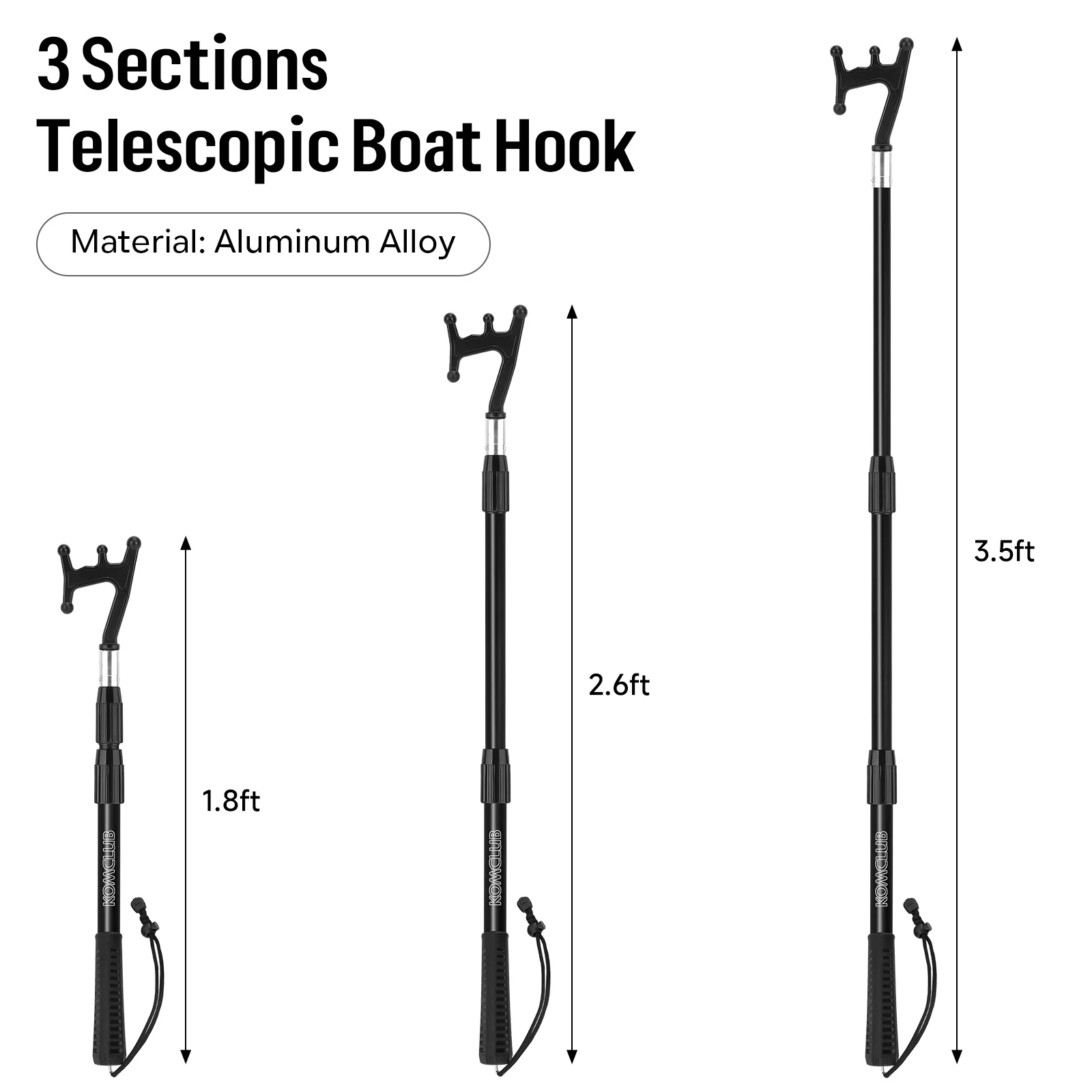 La longitud mínima del gancho para barco de 3 secciones es de solo 1,8 pies, fácil de transportar.El poste telescópico del gancho para barco se extiende hasta 3,5 pies.Fácil de sacar y retraer.Cuenta con empuñadura de goma antideslizante y cordón portátil para un uso más seguro.
