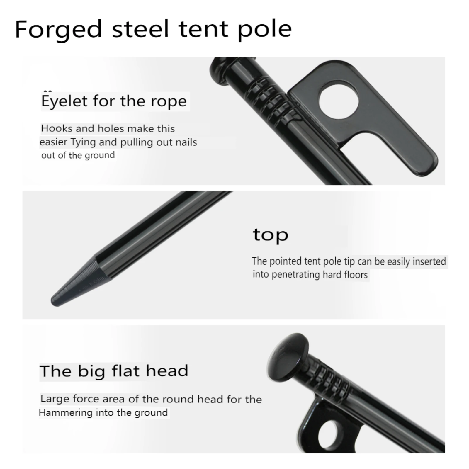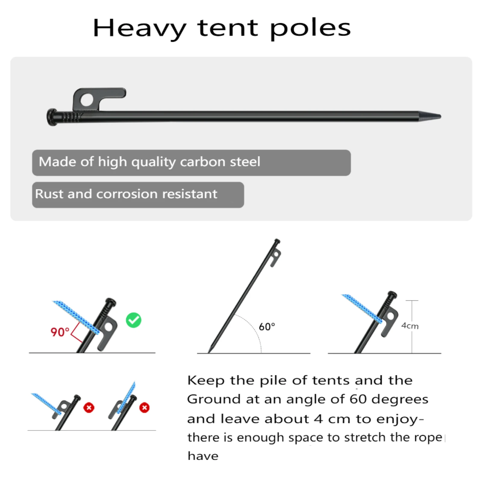 1.Material sólido: acero seleccionado de alta calidad para construir, la superficie del tratamiento ennegrecido, resistente y duradero, sin miedo a los fuertes vientos, protección estable de la tienda.
