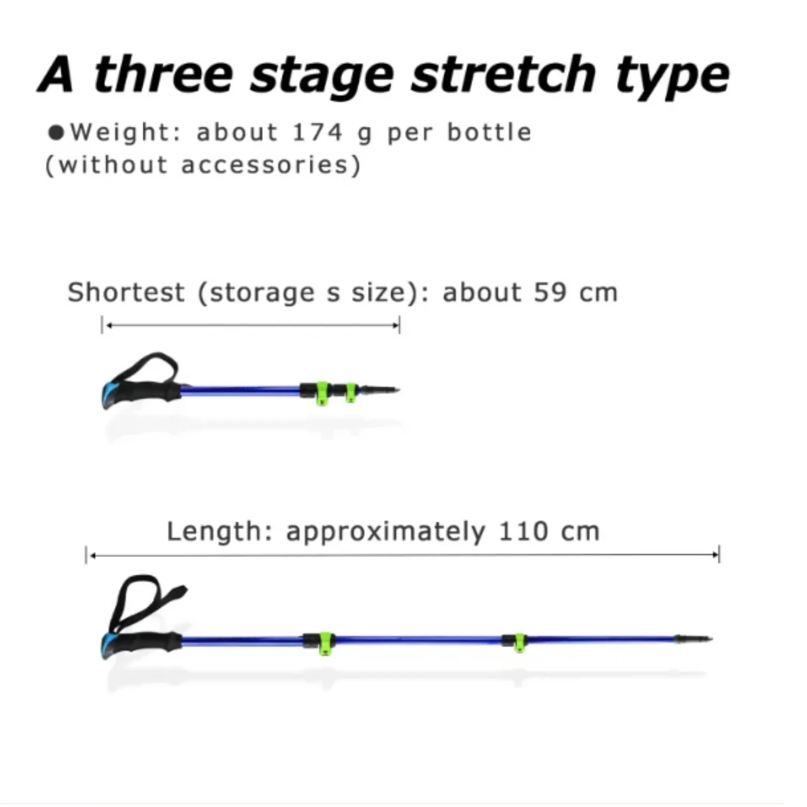 1.[Tipo de poste telescópico de 3 niveles] Bastes de trekking tipo poste telescópico de 3 niveles con longitud fácilmente ajustable.La longitud usada puede ser de unos 110 cm.El diámetro del eje de 3 etapas es de aproximadamente 14 mm/16 mm/18 mm.