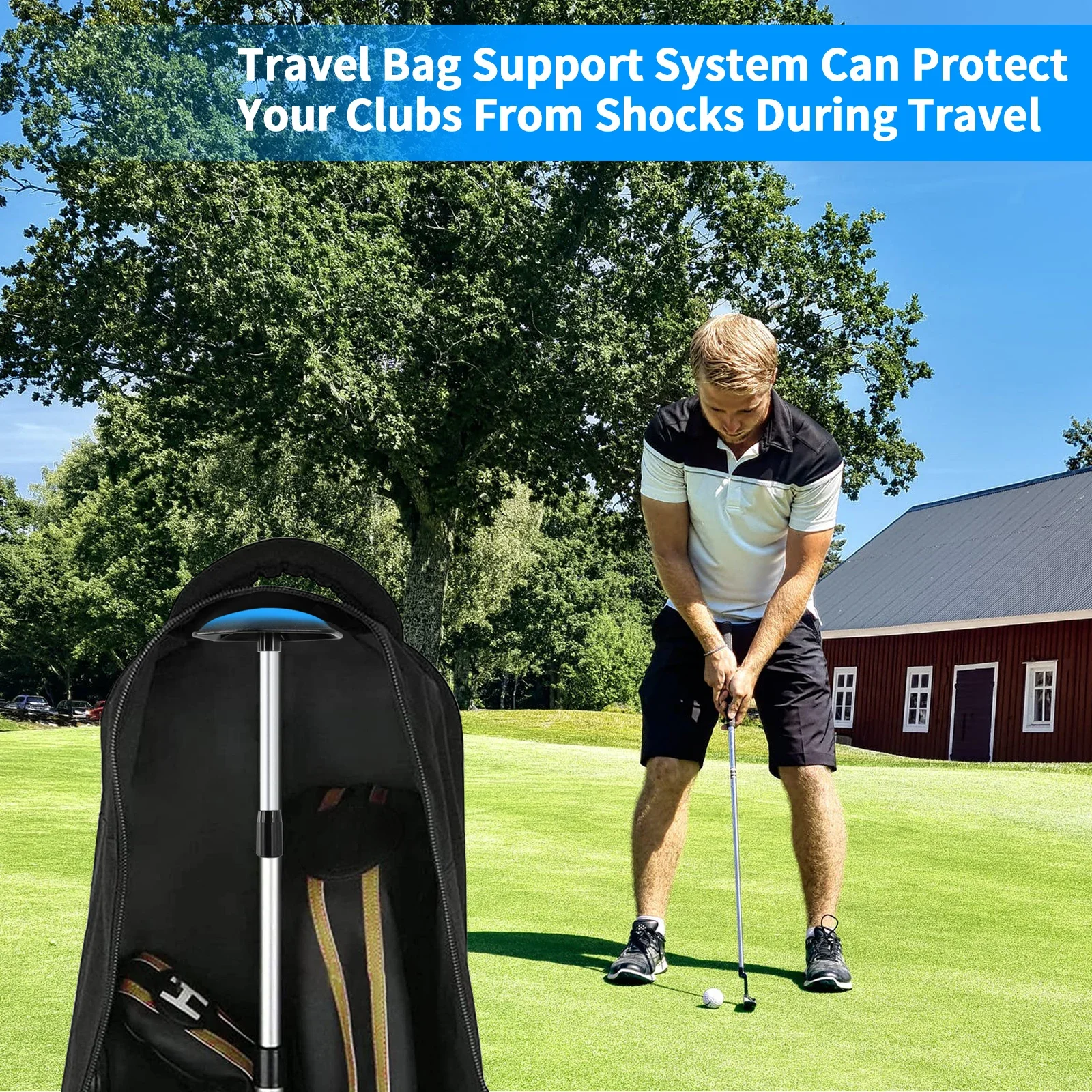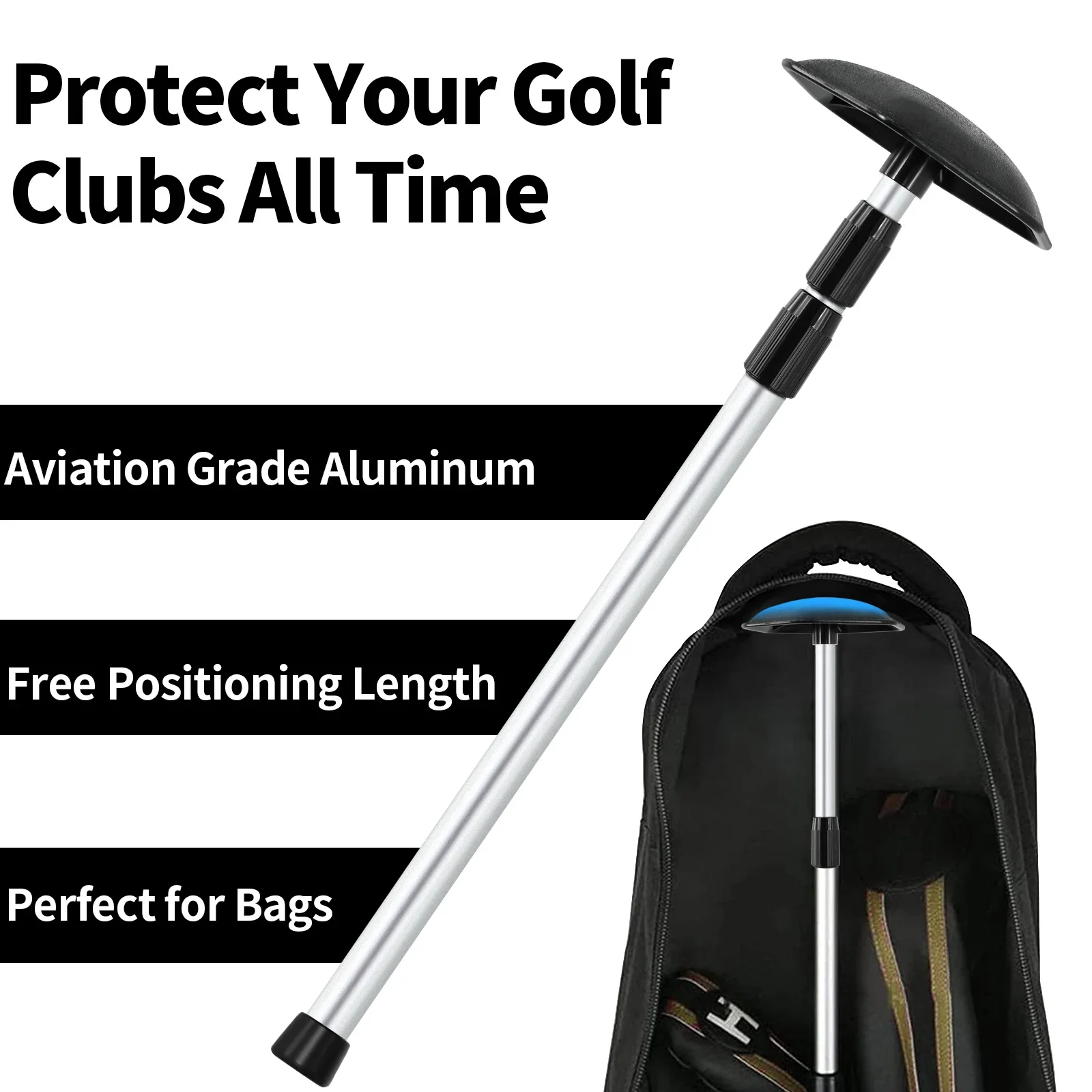1.DISEÑO RESISTENTE AL IMPACTO: La goma de la funda de soporte superior de nuestro poste de soporte para bolsa de golf es fuerte y flexible, la funda de soporte duradera y engrosada protege sus valiosos palos de golf mientras viaja.