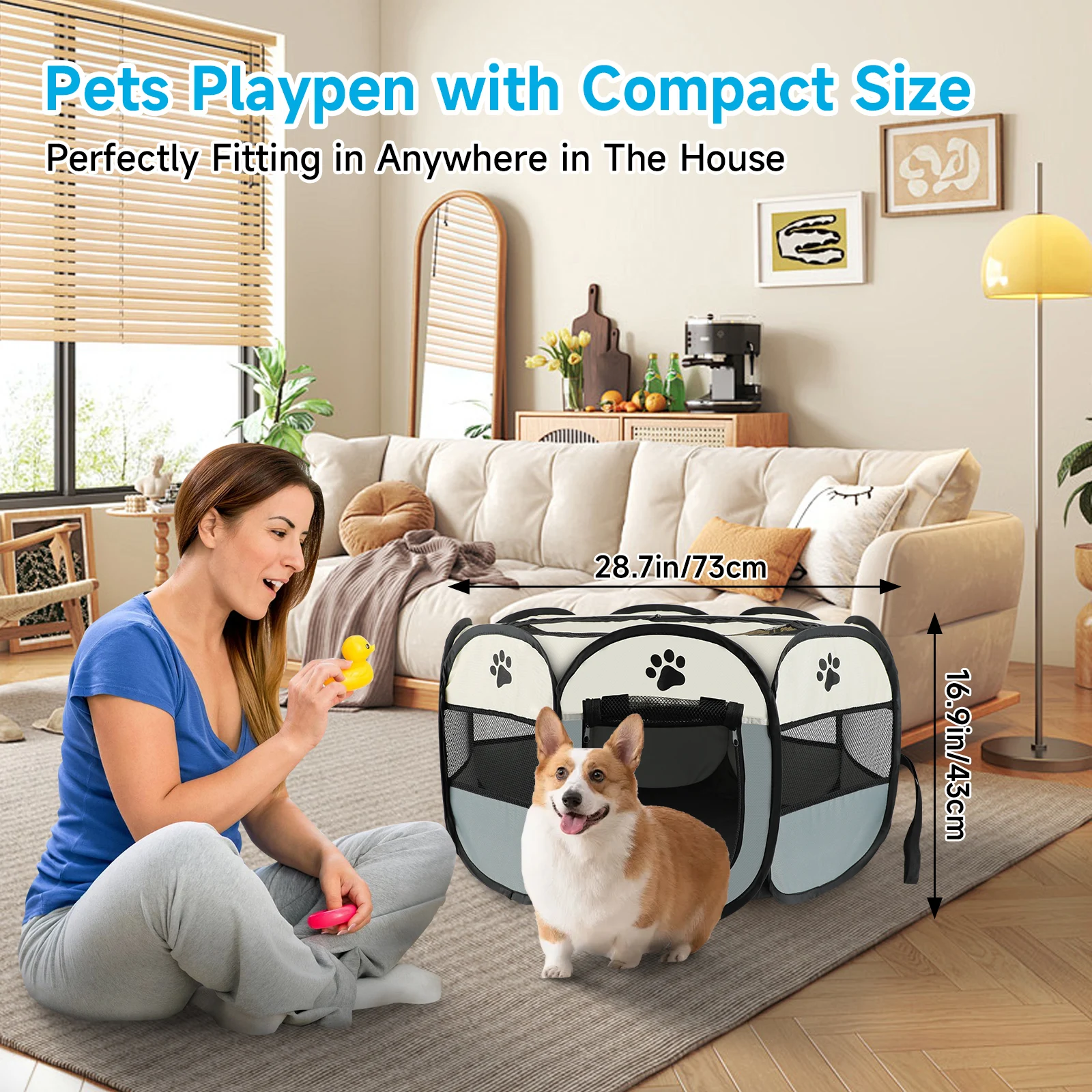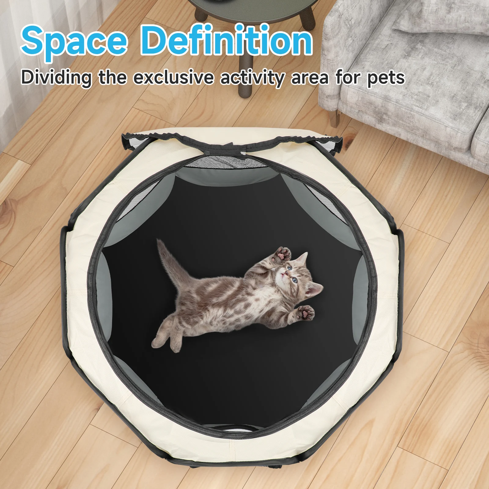 Diseño seguro: 8 paneles laterales rodeados por un círculo, hechos de malla gruesa de alta calidad y tela Oxford resistente a los arañazos, vista soleada de 360 grados, interior espacioso y bien ventilado, techo de malla para evitar la ansiedad de las mascotas, las mascotas pueden mirar a través de la malla hacia el mundo exterior y siéntete seguro.