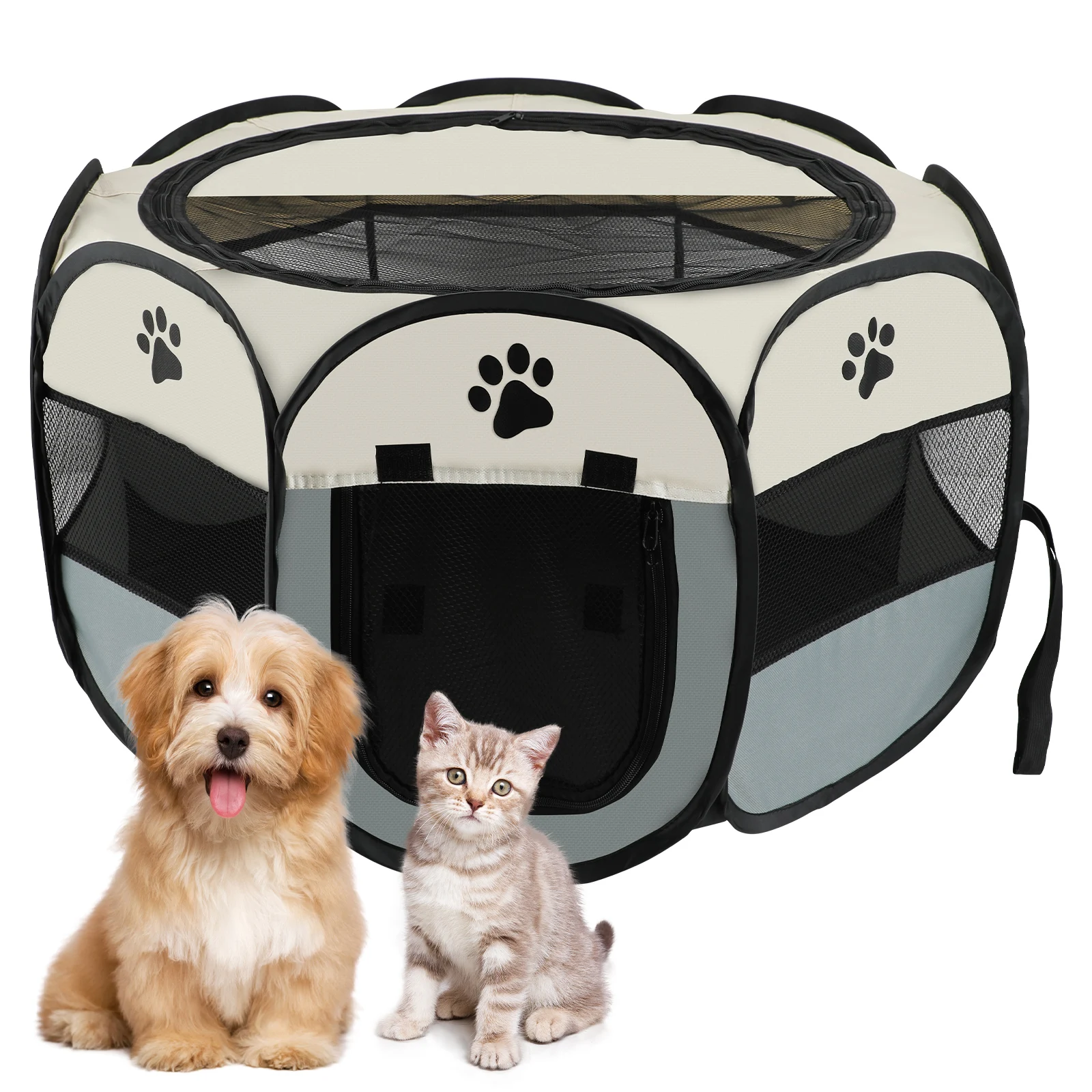 3.Cómodo de usar: entrada con cremallera de malla en el lateral, puerta con cremallera para que las mascotas entren y salgan, se puede fijar con velcro para abrir la puerta, cremallera la cremallera para levantarla y manejar mascotas, con asas, liviana y fácil de transportar. interior y exterior, se pueden utilizar parques, playas y otros lugares.
