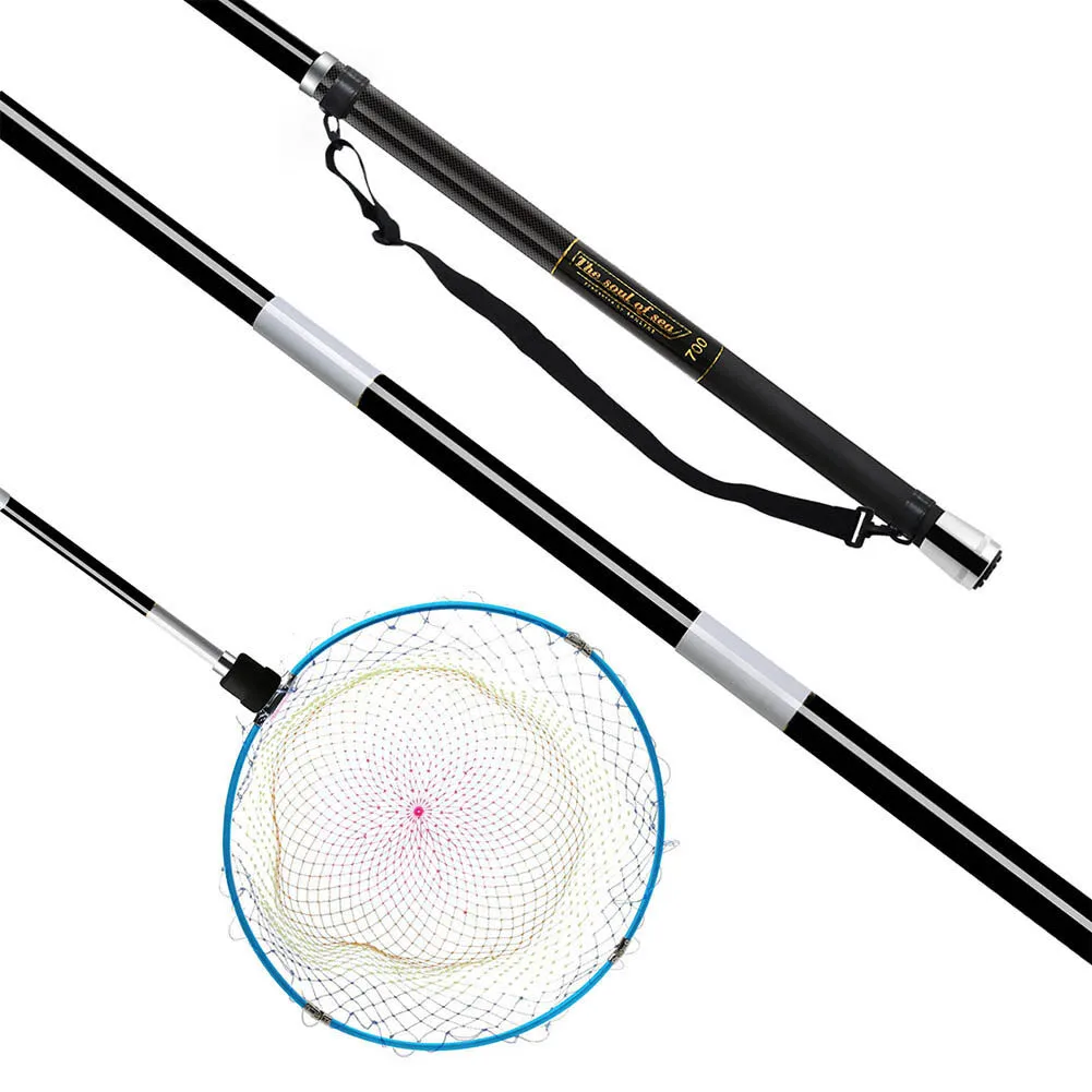 1. La red es desmontable y plegable, y el mango es de tipo retráctil que permite un almacenamiento compacto, lo que lo convierte en un práctico aparejo de pesca.