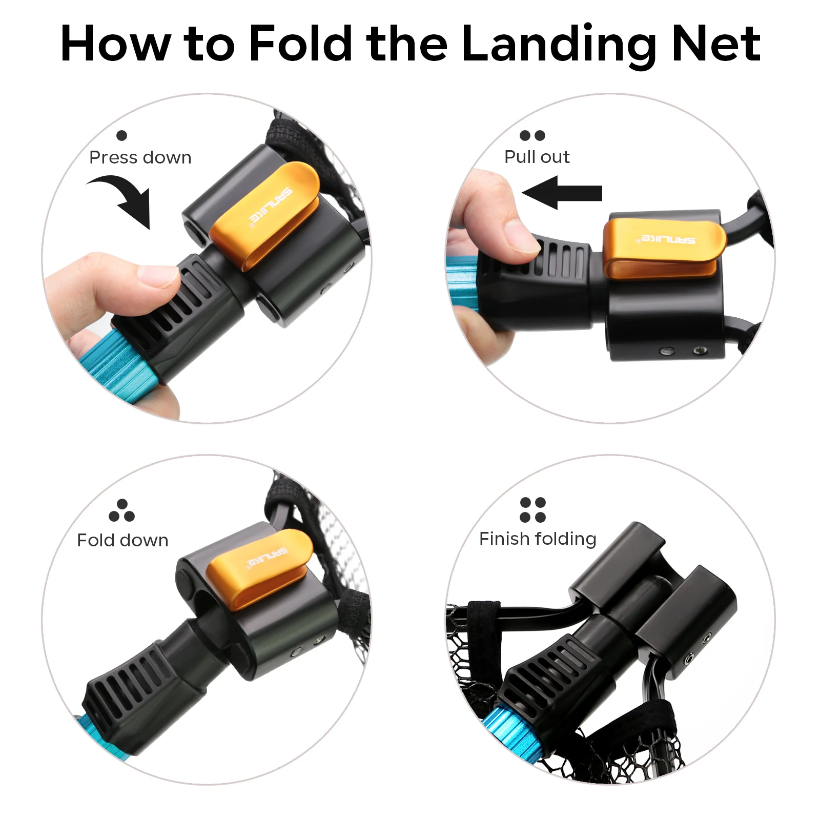 Consejo: para doblar esta red de pesca, suelte el interruptor giratorio y Deje un poco de longitud para el botón plegable.