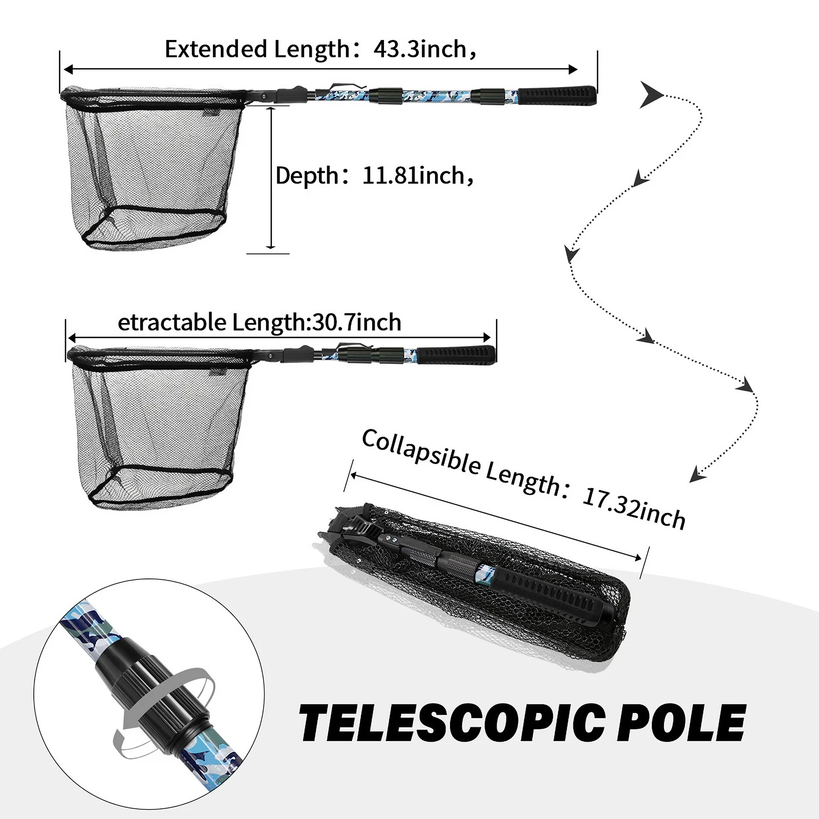 1. ¡La red de pesca SAN LIKE es una red de aterrizaje! Longitud extendida 43 pulgadas. Longitud plegada: 17 pulgadas. Tamaño del anillo: 17 ''. Profundidad neta: 12 ''.