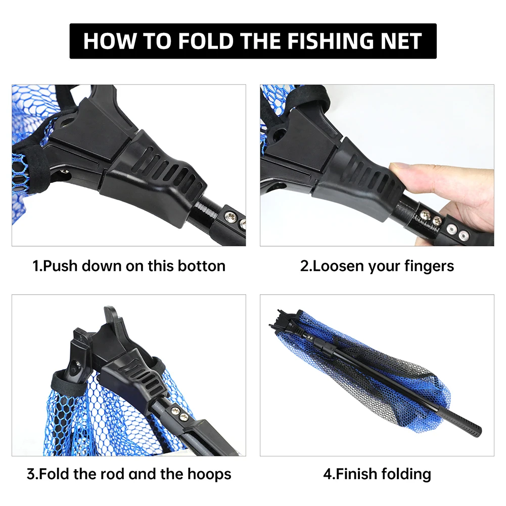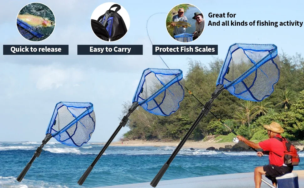 1. LIGERO Y PORTÁTIL, PLEGABLE COMO VAS: El mango está diseñado con fibra fuerte y liviana.El diseño liviano y plegable lo hace compacto y fácil de transportar y almacenar.Diseño de poste telescópico con hebilla de placa, capacidad de carga para capturar peces más pesados.