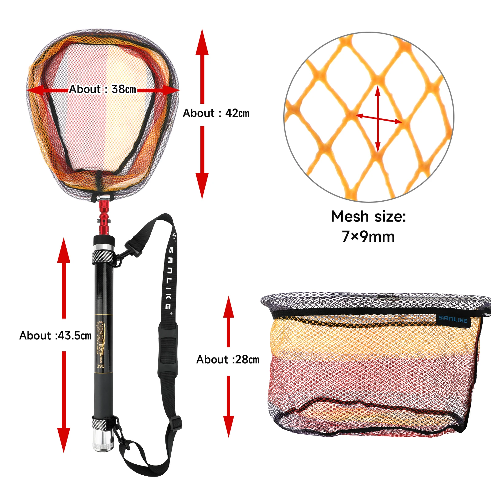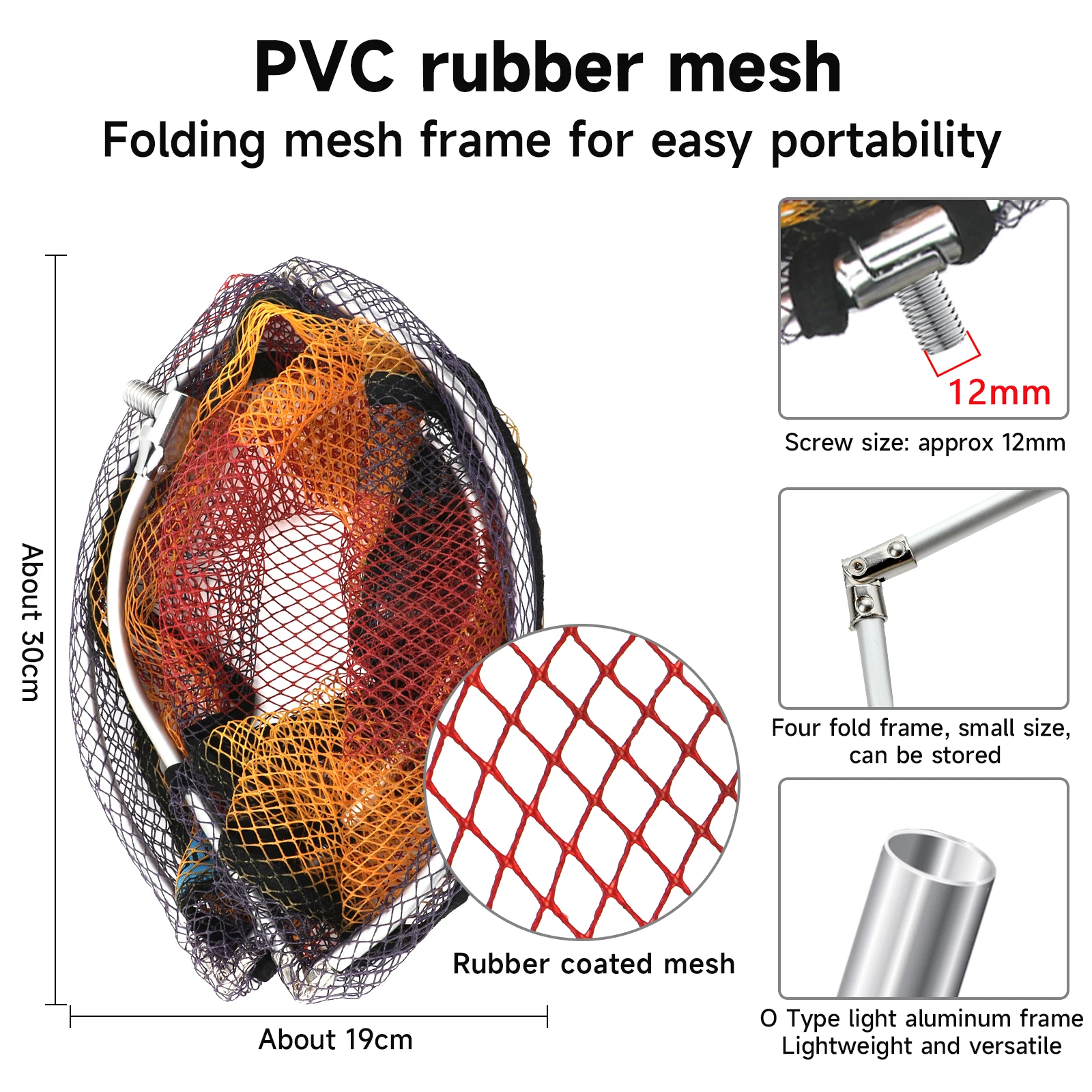 Material: fibra de vidrio (varilla) + PE (neto) + aleación de aluminio (cabeza plegable)
