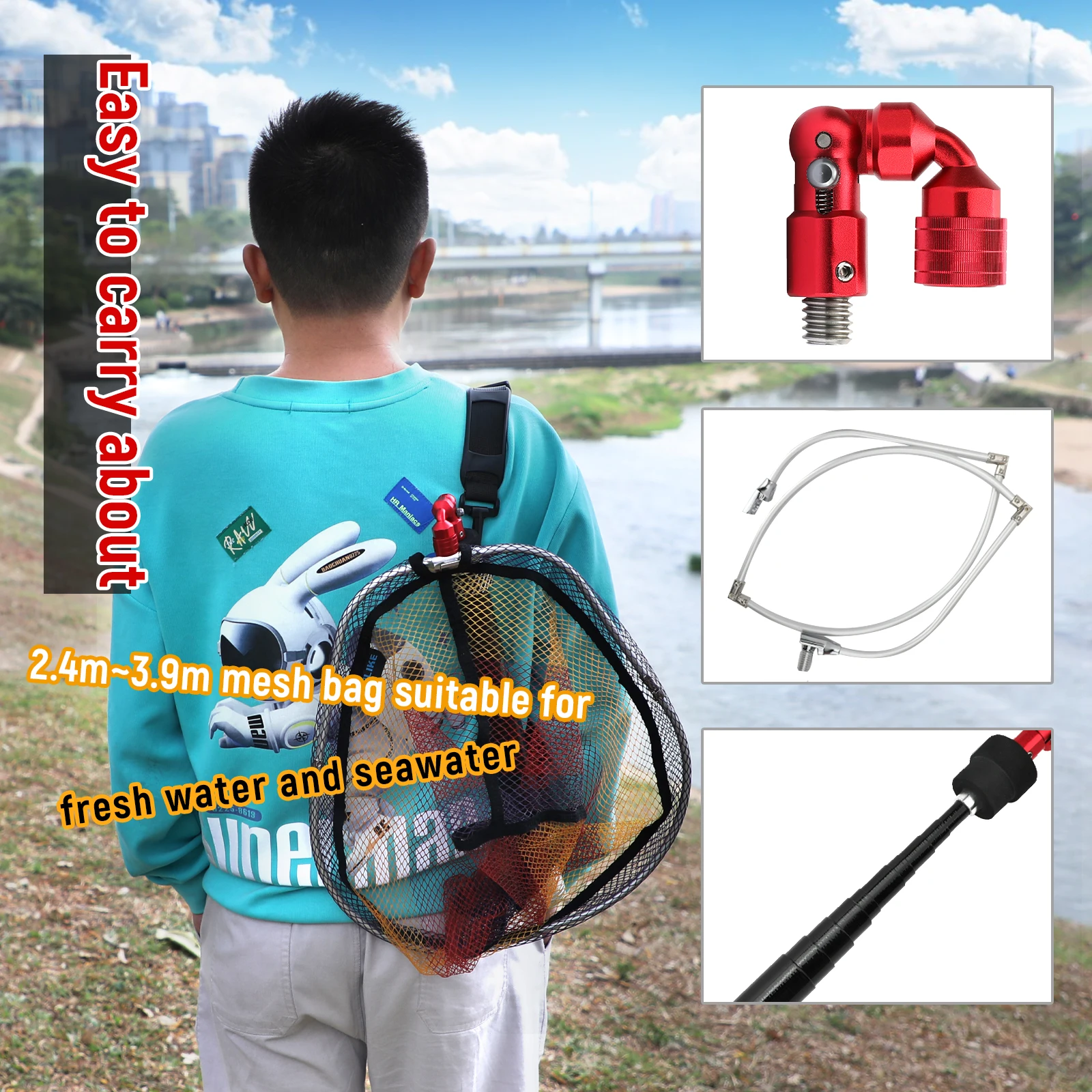 3.[Cómodo de llevar] Viene con un cinturón para el hombro, la red es desmontable y plegable, y el mango es elástico para un almacenamiento compacto, lo que la convierte en un equipo de pesca conveniente para moverse.