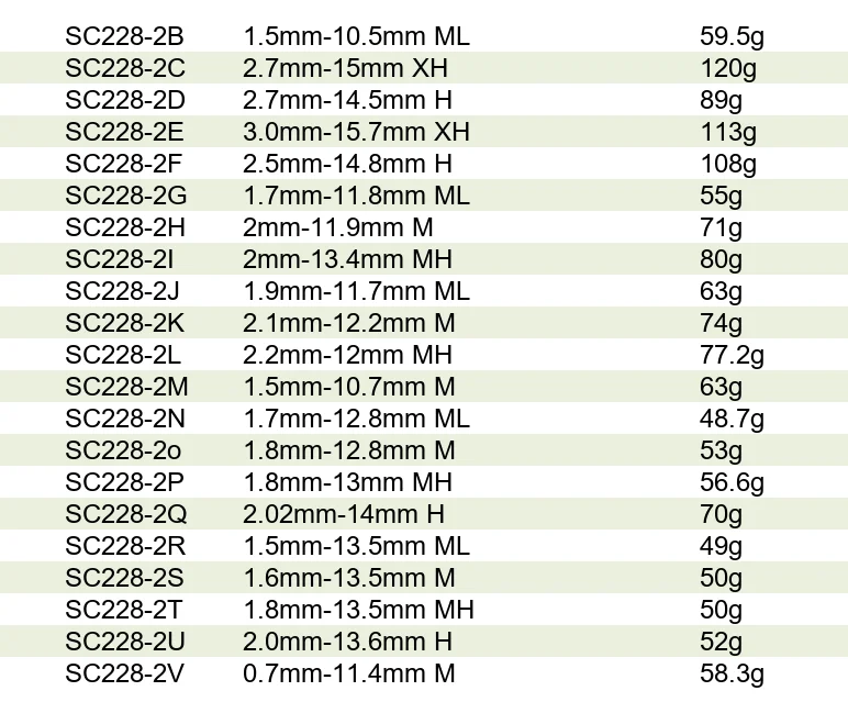 SC228-2X 2,5 mm-15,2 mm H 100 g no más disponibles***SC228-2U real 1,75 mm-14,3 mm H 61,5 g (2025-08-09)Atención, los tamaños o pesos de las secciones en blanco son solo como referencia, son sobre otros, puede haber diferencias.